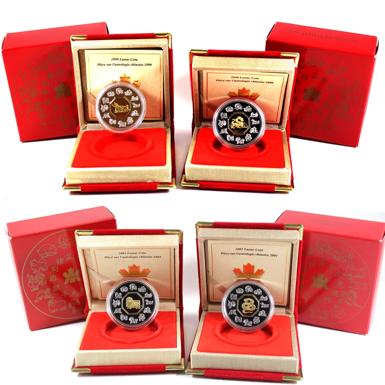 1999-2003 Canada $15 Lunar Sterling Silver and Gold Plated Cameo Coins: 1999 Rabbit, 2000 Dragon, 2001 Snake & 2003 Sheep. Coins come with all original Mint packaging (capsules are scuffed, and outer boxes contain various imperfections). 4pcs