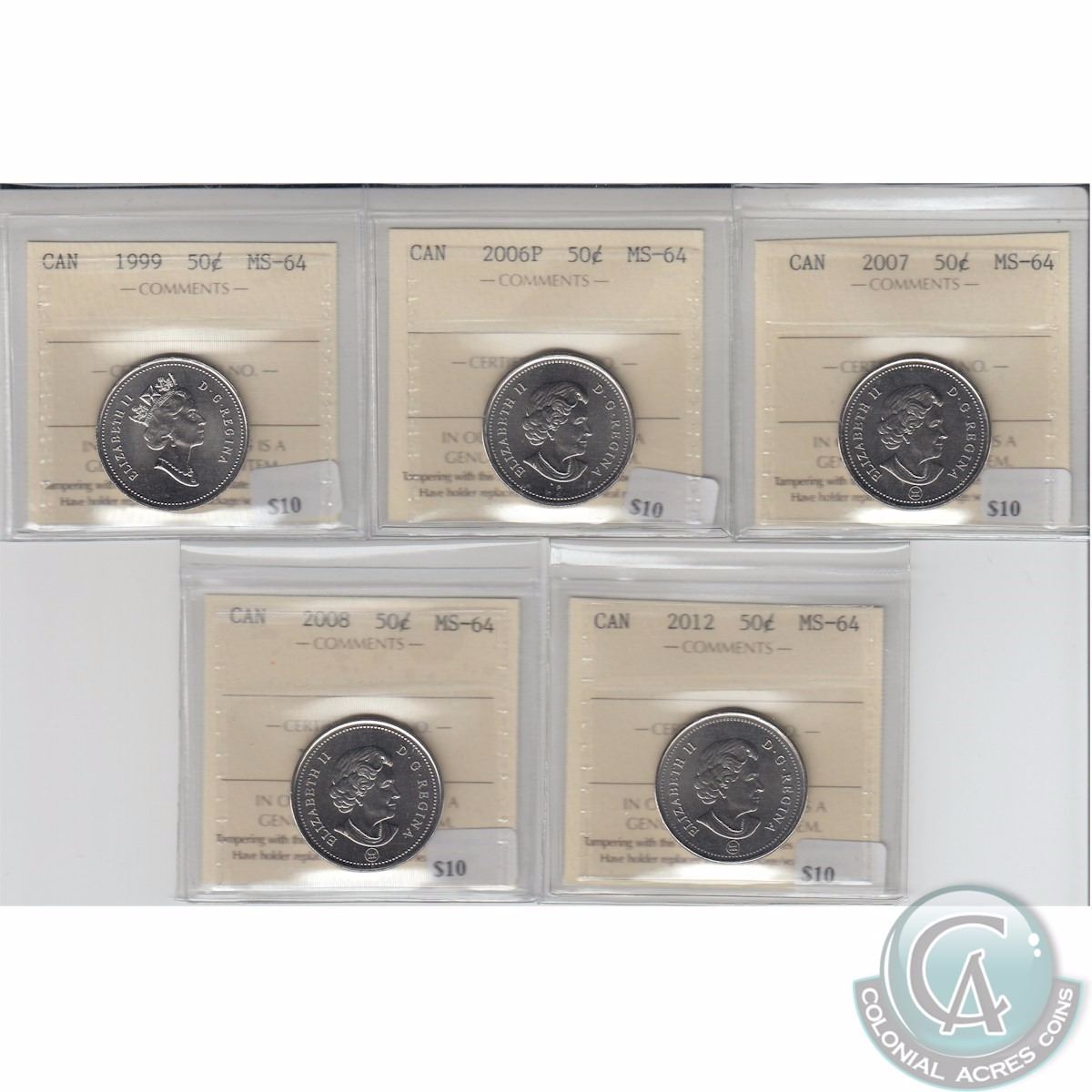 1999, 2006P, 2007, 2008 & 2012 Canada 50-cent all ICCS Certified MS-64 (5pcs)