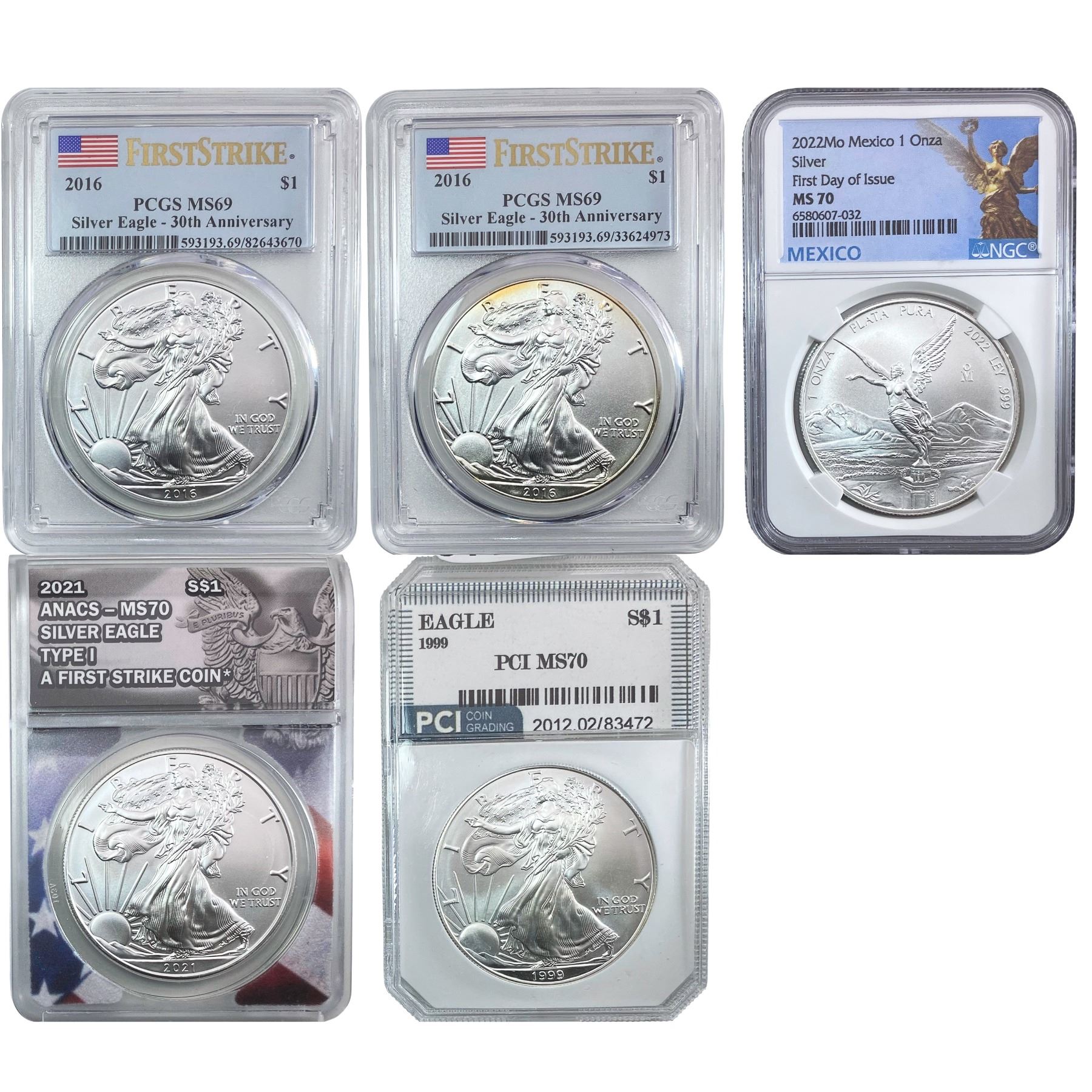 1999-2022 GEM BU Silver Eagle/1 Onza [5 Coins] NGC/PCGS/ANACS/PCI MS69/70