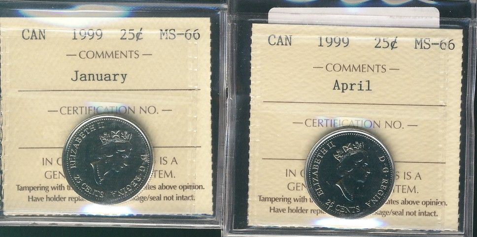 1999 25¢ January & April ICCS MS66. Lot of 2 coins.