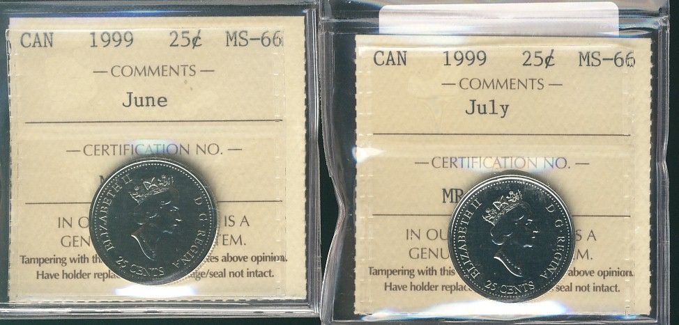 1999 25¢ June & July ICCS MS66. Lot of 2 coins.