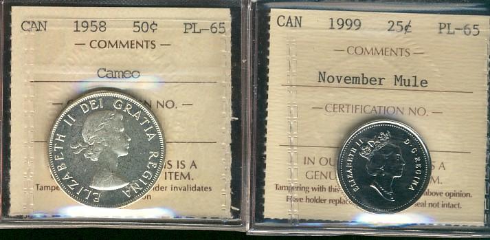 1999 25¢ Nov Mule & 1958 50¢ PL65. Lot of 2 coins. 1958 is designated Cameo.