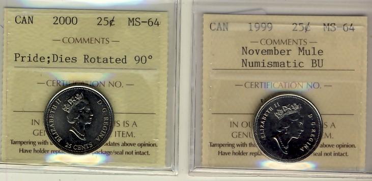 1999 25¢ Nov Mule & 2000 Pride 90% rotated die. ICCS MS64. Lot of 2 coins.