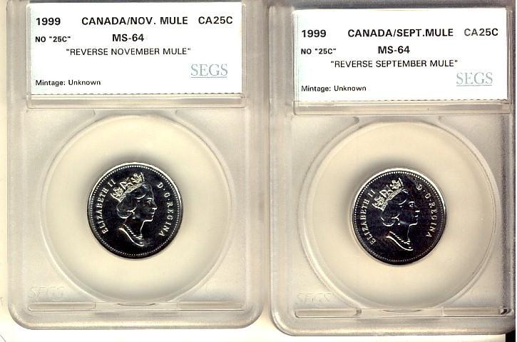 1999 25¢ November/September Mule SEGS MS64. Lot of 2 coins. Pittman example.
