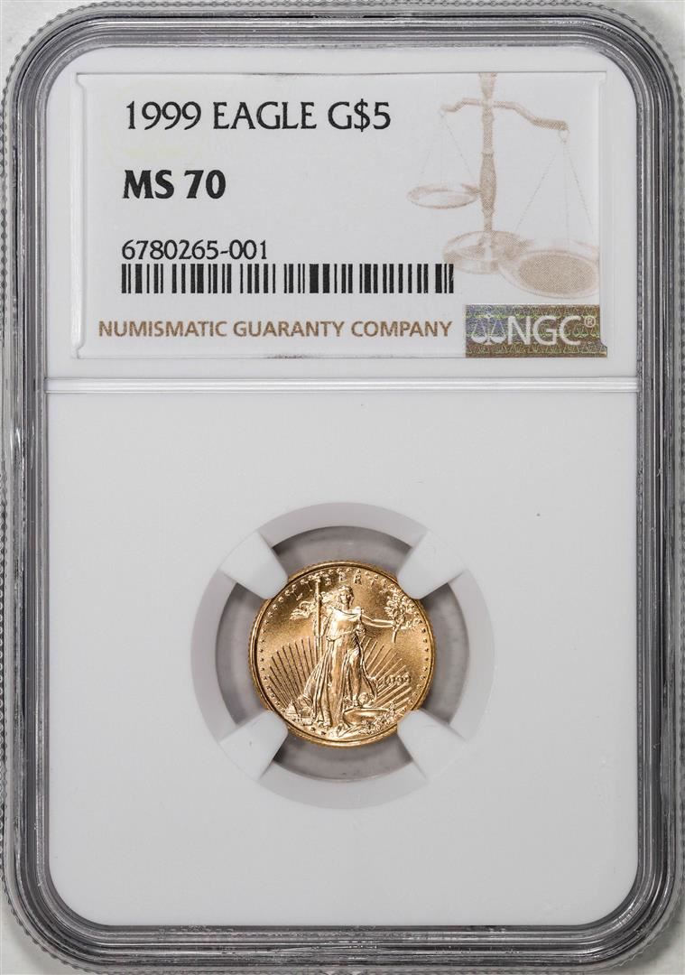 One 1999 $5 American Gold Eagle Coin NGC MS70. NGC Certified.