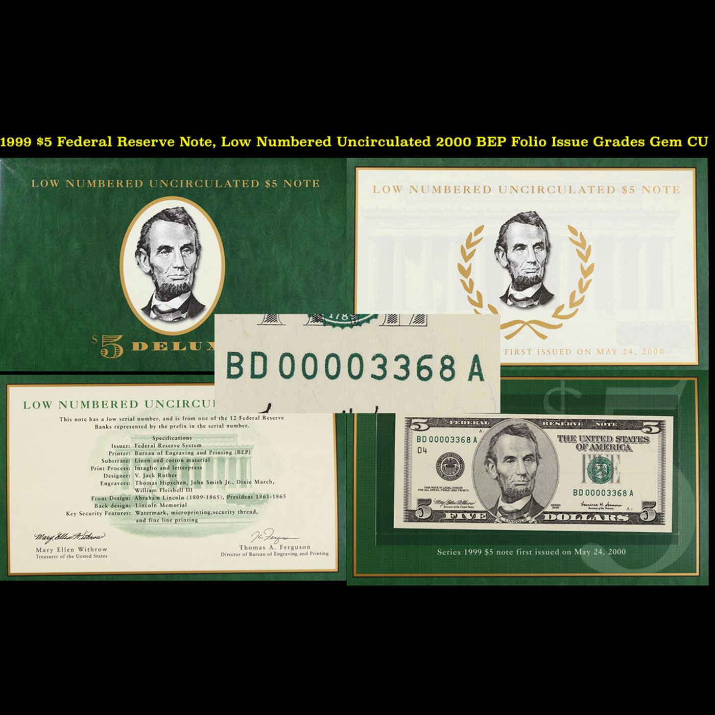 1999 $5 Federal Reserve Note, Low Numbered Uncirculated 2000 BEP Folio Issue Grades Gem CU
