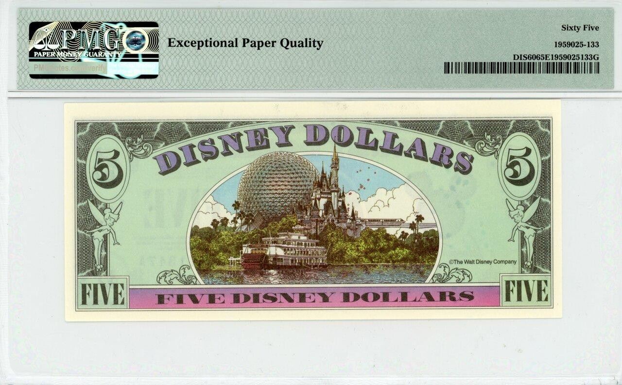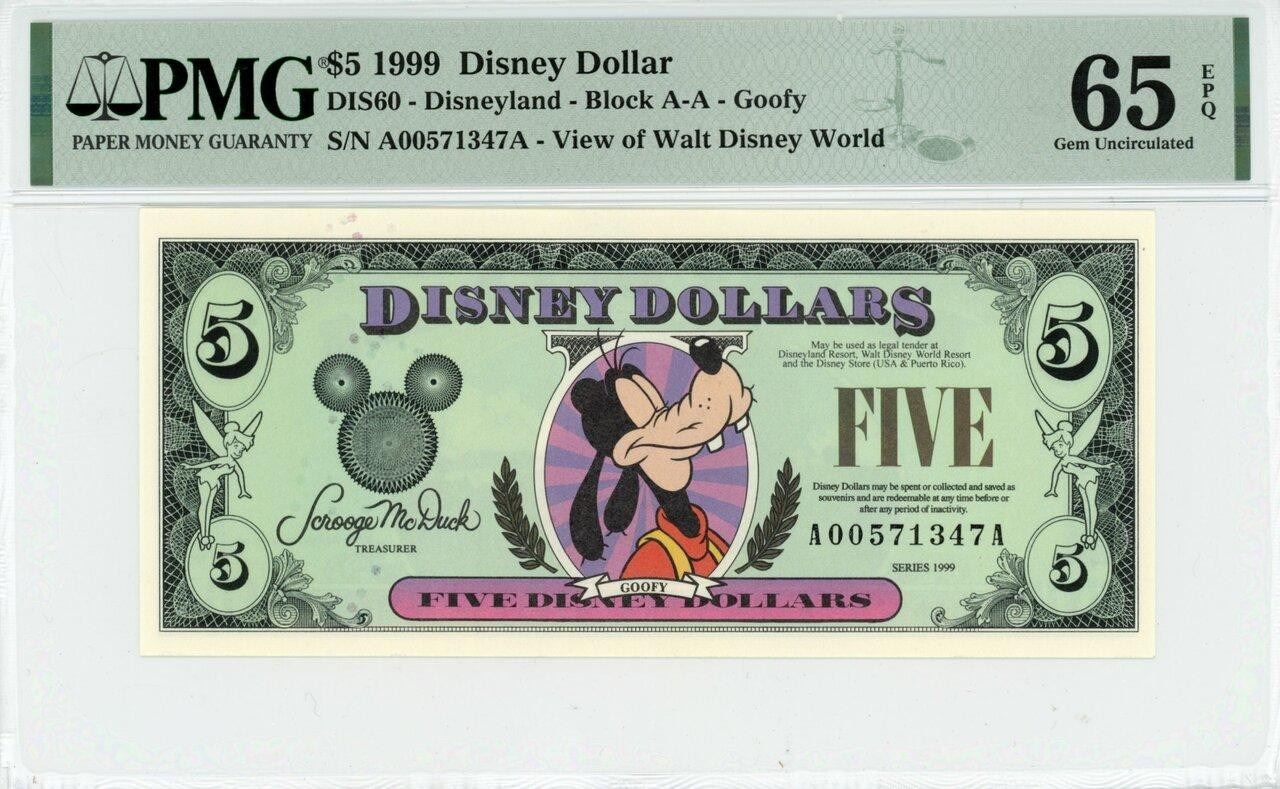 One 1999 $5 Goofy Disney Dollar PMG 65EPQ.