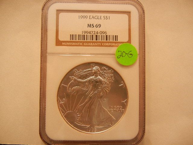 1999 American Silver Eagle, .999 Fine Silver, 1 Troy Oz., Graded by NGC MS69