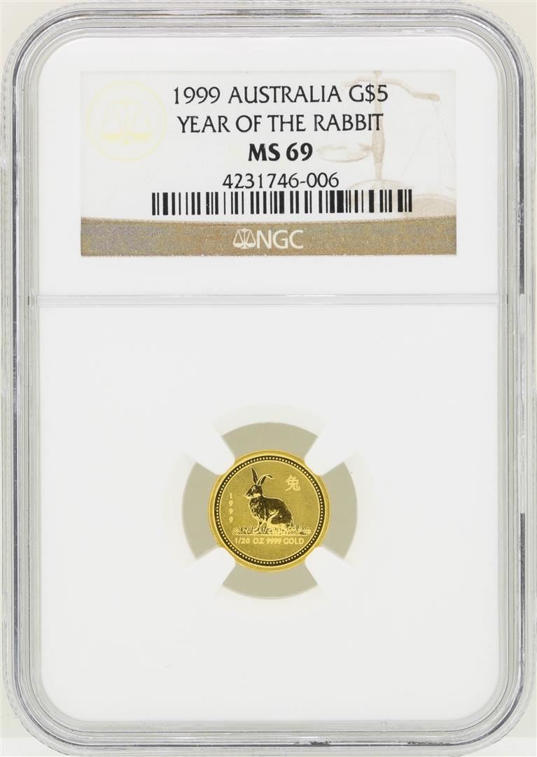 One 1999 Australia $5 Year of the Rabbit Gold Coin NGC MS69. NGC Certified.