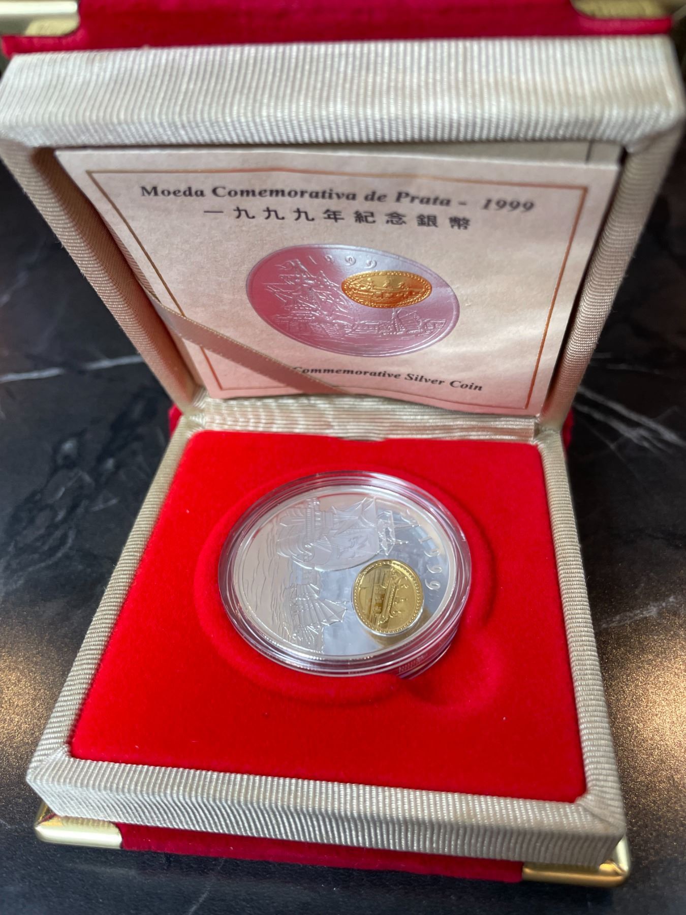 Features a Portuguese ship and a Chinese barque. The oval-shaped design depicts the most historical relic of Macau - Ma Gao Temple - the spot where the Portuguese first landed. It is said that the name of Macau originated from 'Ma Gao'. At the top is the inscription '1999' - the year of the return of Macau to China.