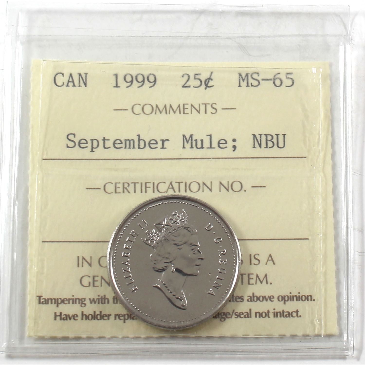 1999 Canada 25-cent September Mule ICCS Certified MS-65 Numismatic BU