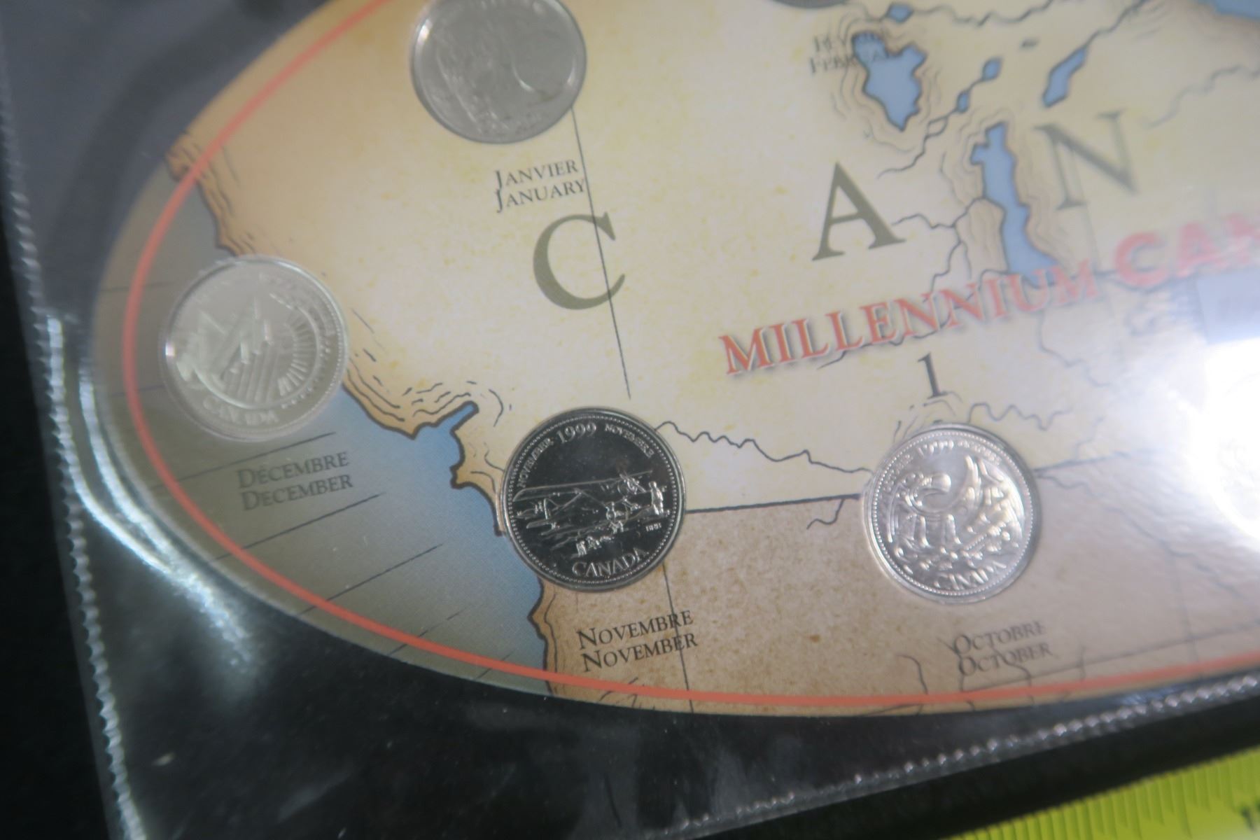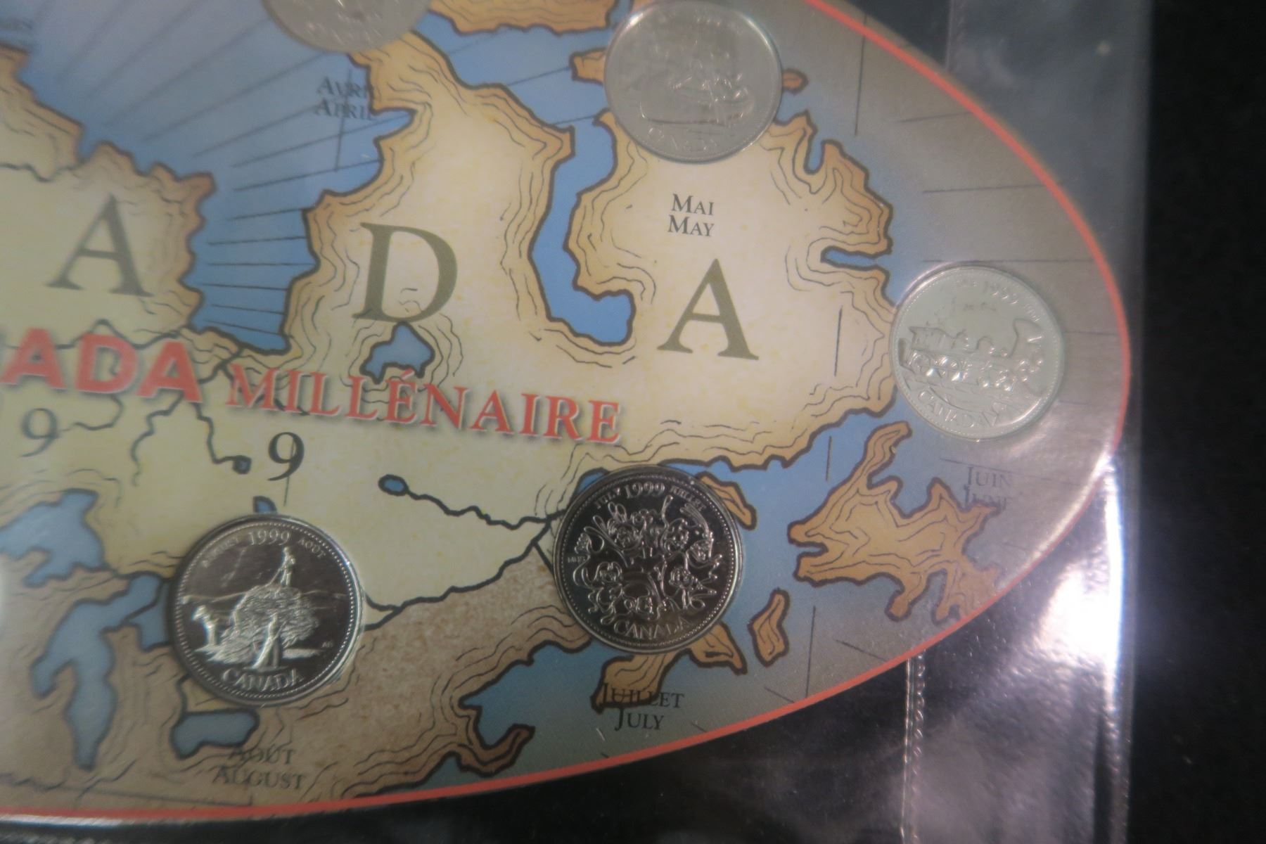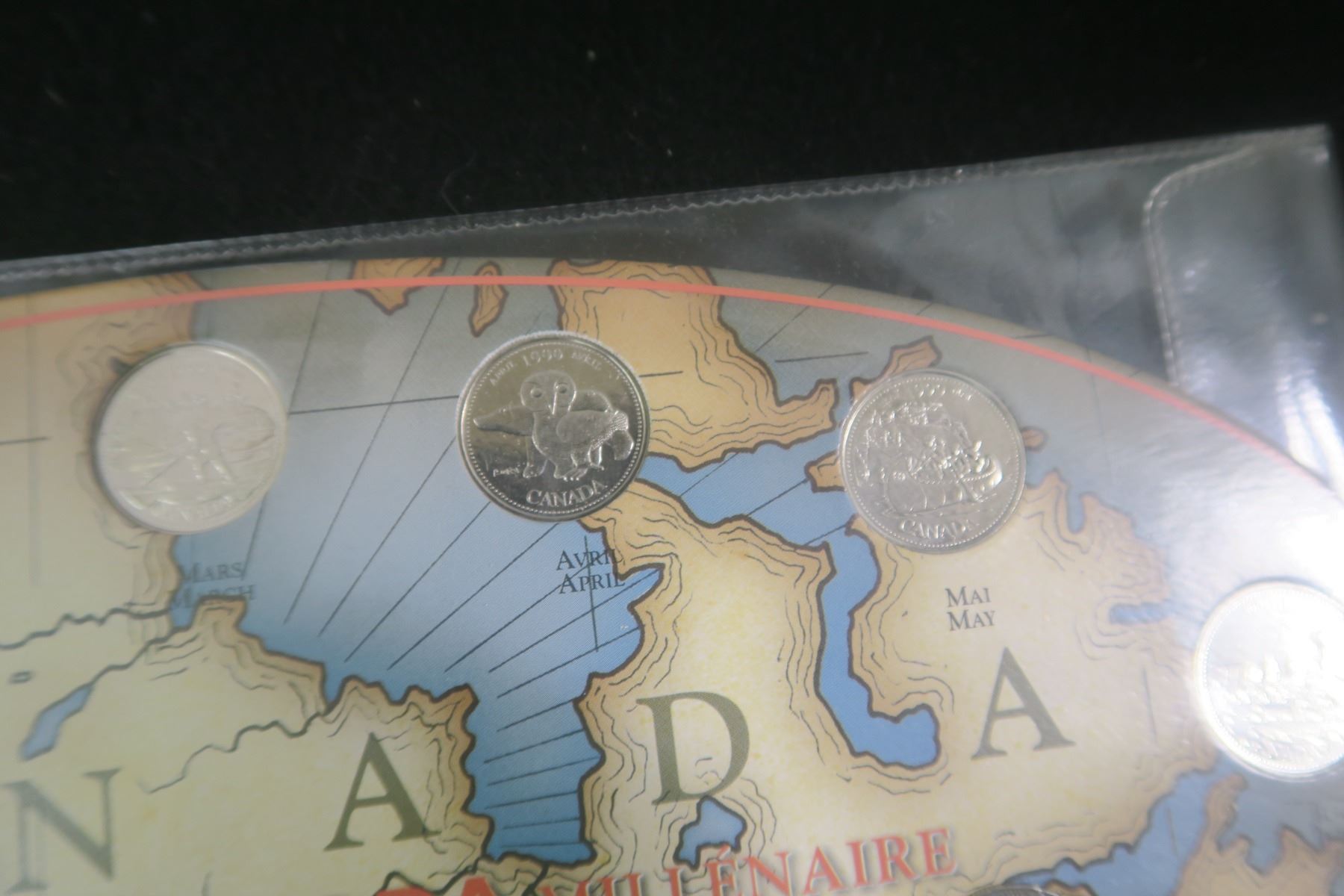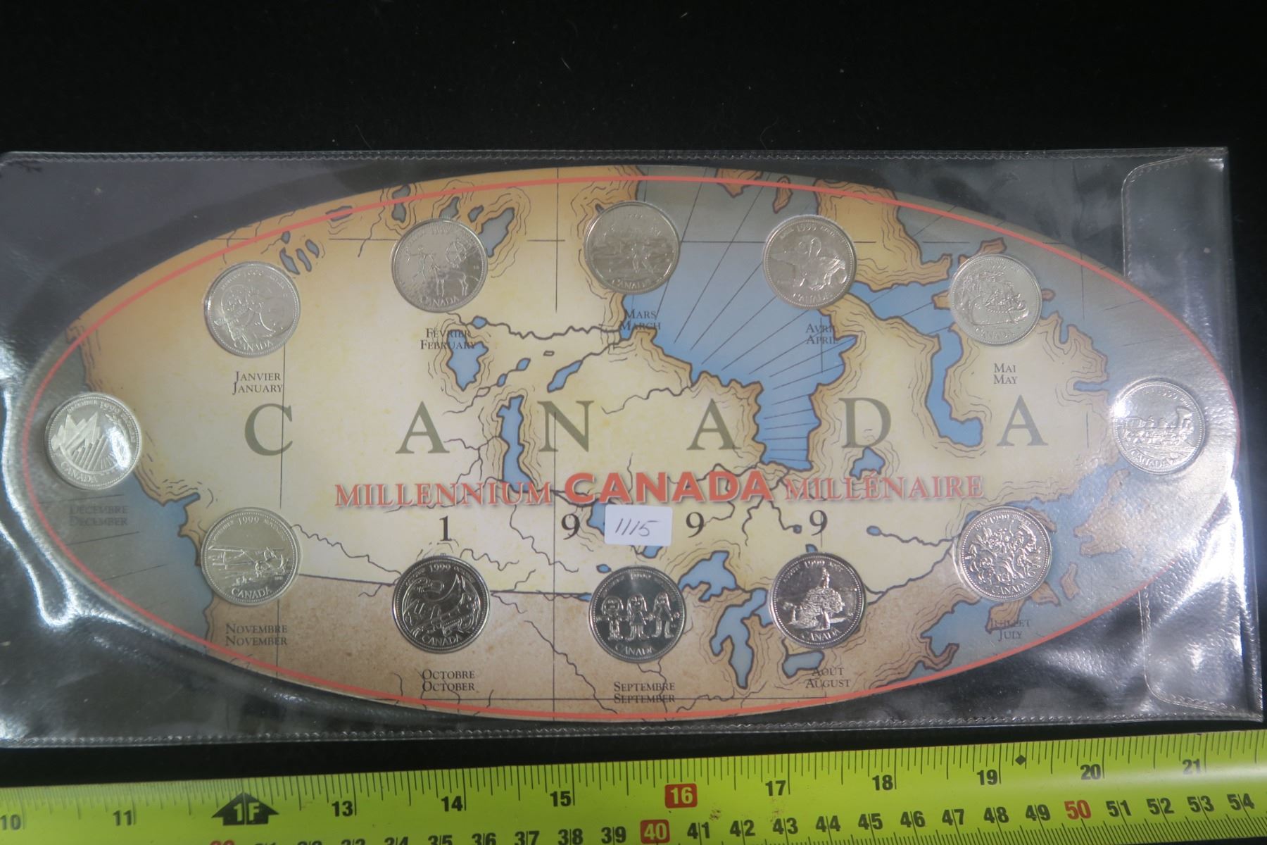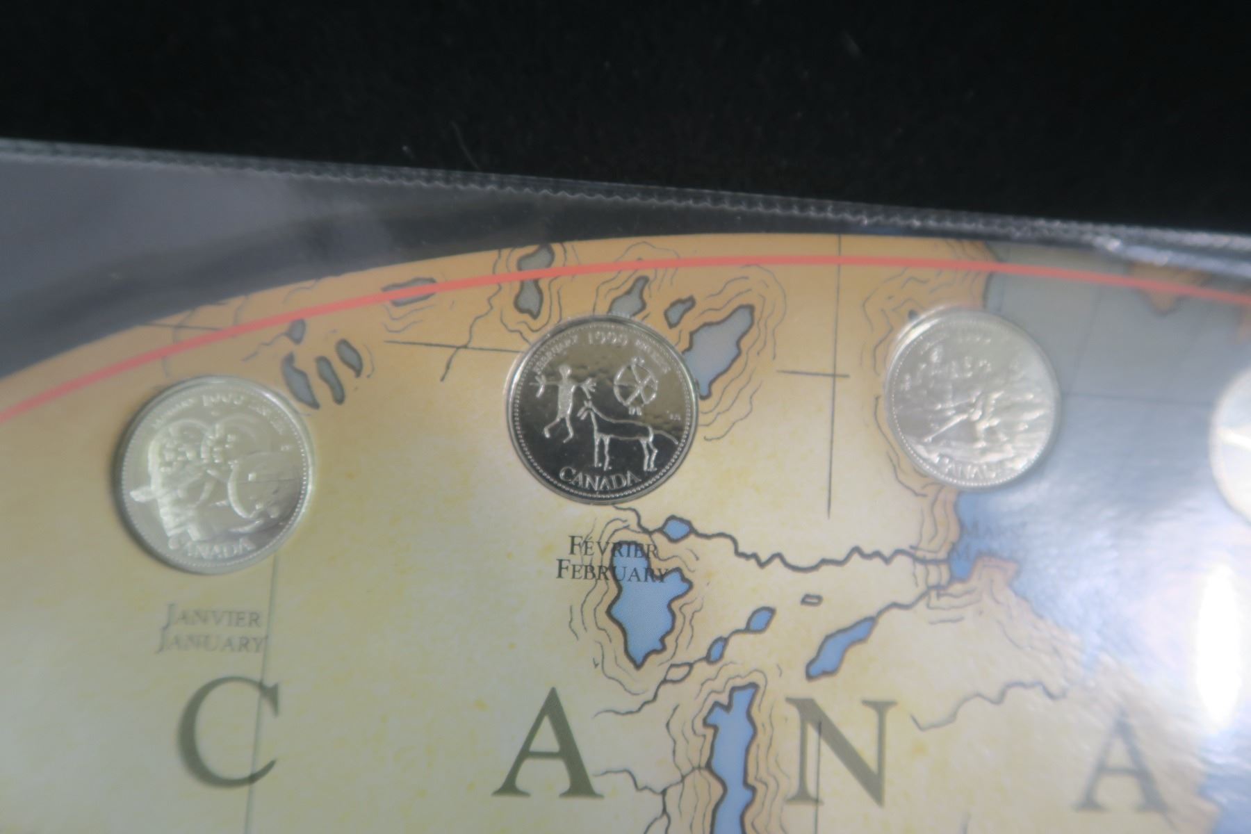 1999 Canada Millennium set of 12 coins. Includes 12 25 cents for each of the 12 months of the year. Housed in a replica 1785 map of Canada. All Brilliant Uncirculated.