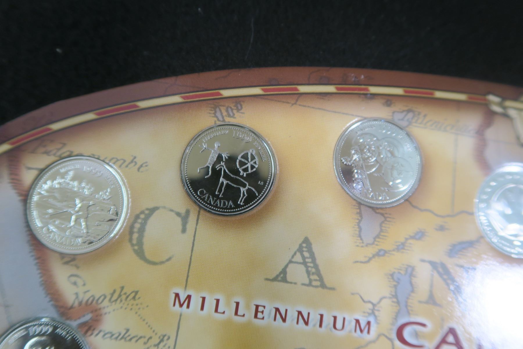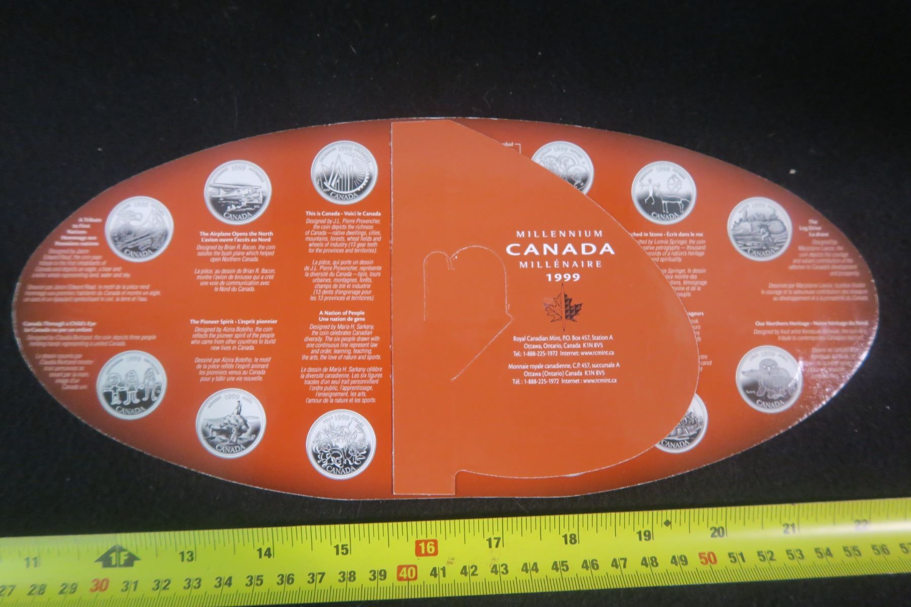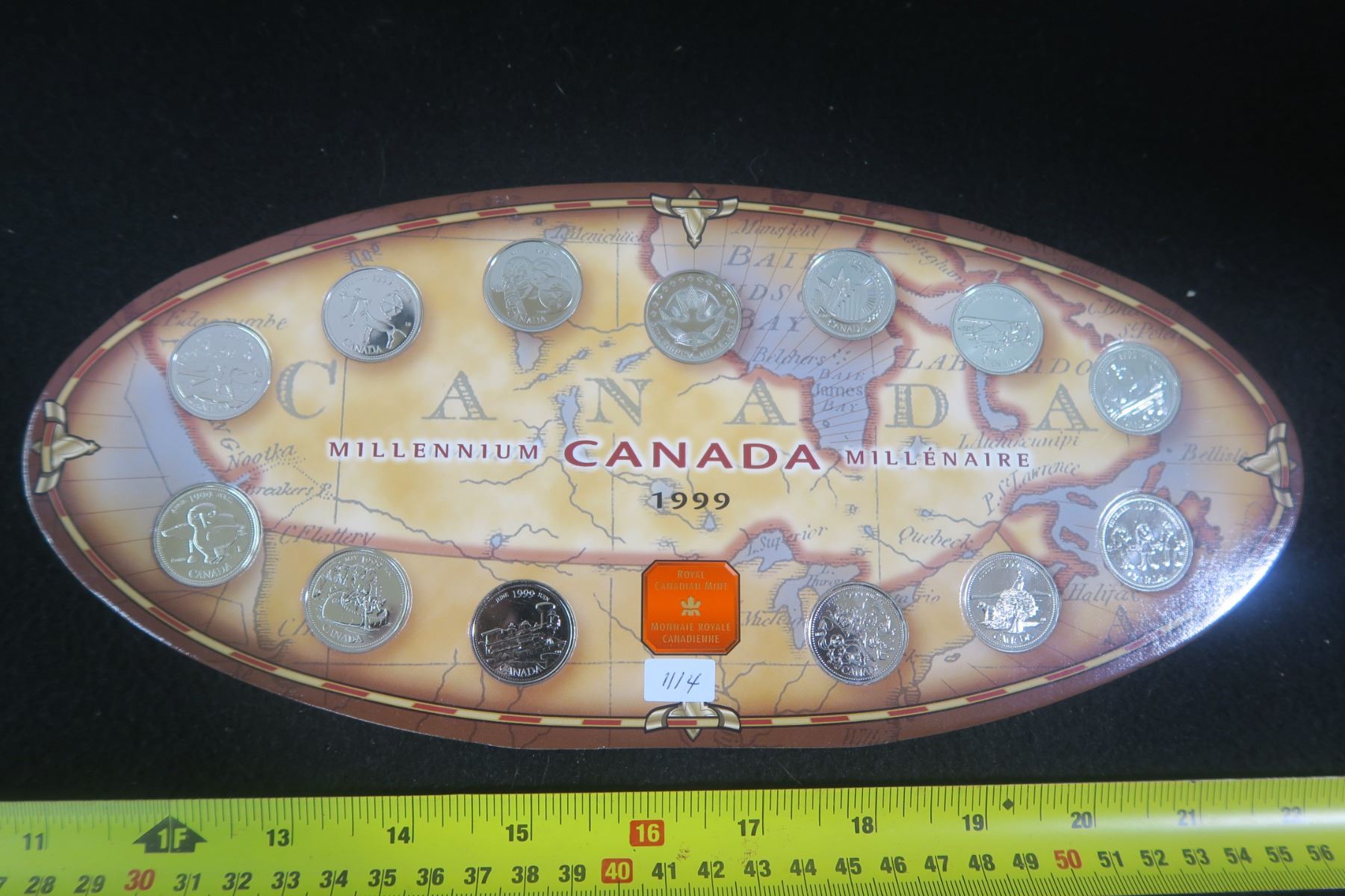 1999 Canada Millennium set of 12 coins and medal. Includes 12 25 cents for each of the 12 months of the year and one Royal Canadian Mint Millennium medal inserted in a replica 1785 map of Canada, as issued by the Royal Canadian Mint All Brilliant Uncirculated.