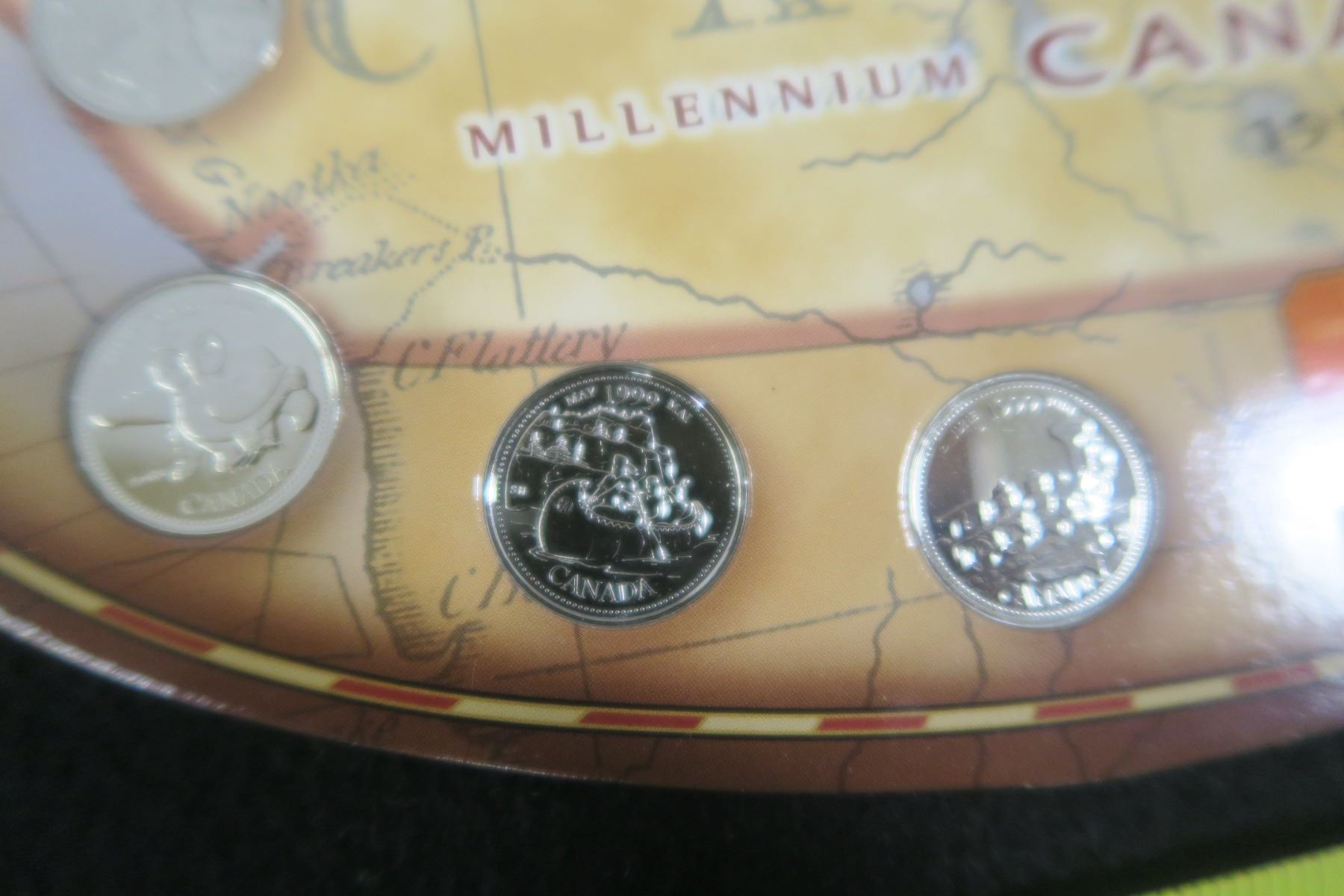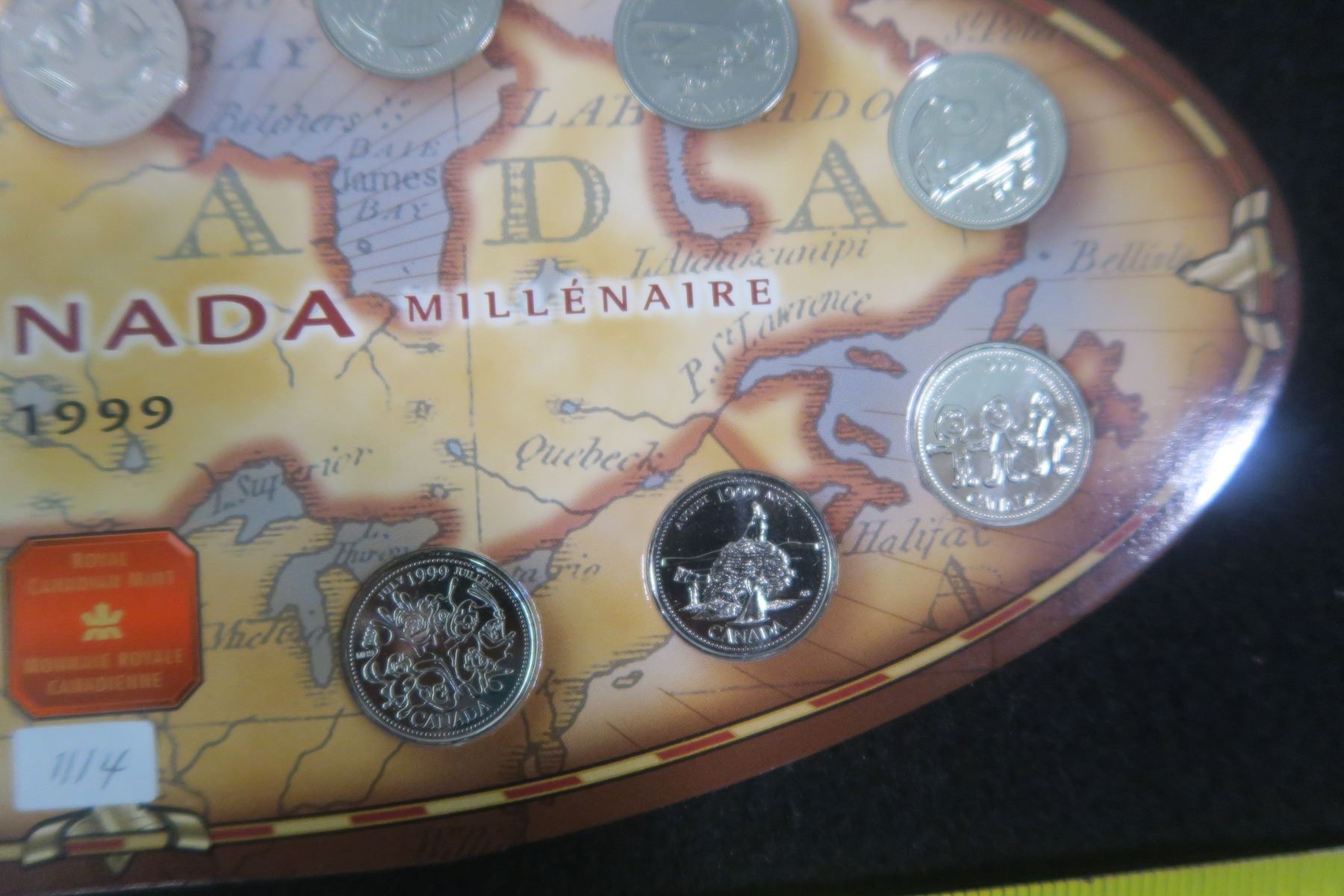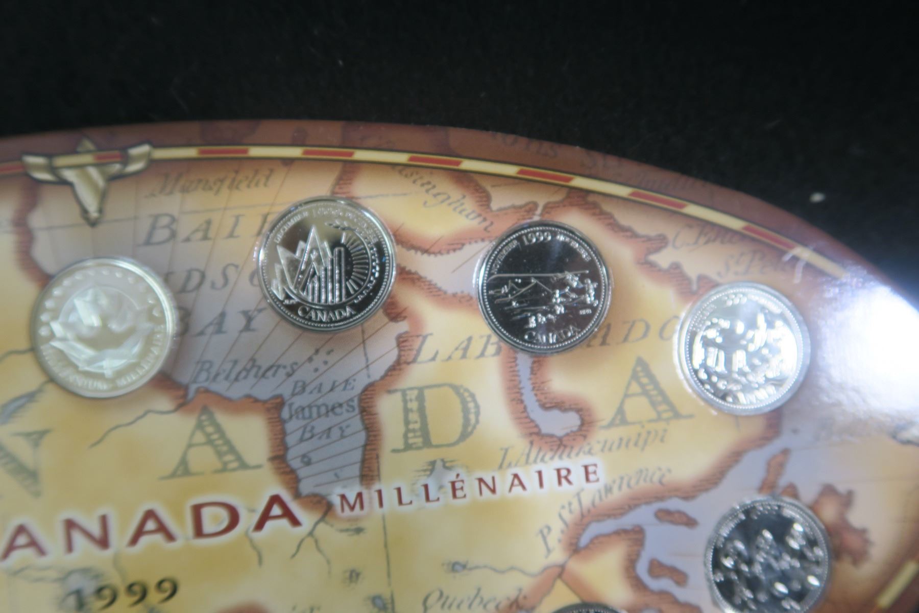 1999 Canada Millennium set of 12 coins and medal. Includes 12 25 cents for each of the 12 months of the year and one Royal Canadian Mint Millennium medal inserted in a replica 1785 map of Canada, as issued by the Royal Canadian Mint All Brilliant Uncirculated.