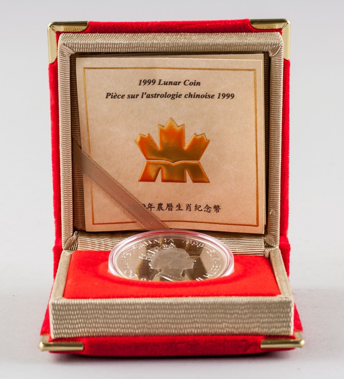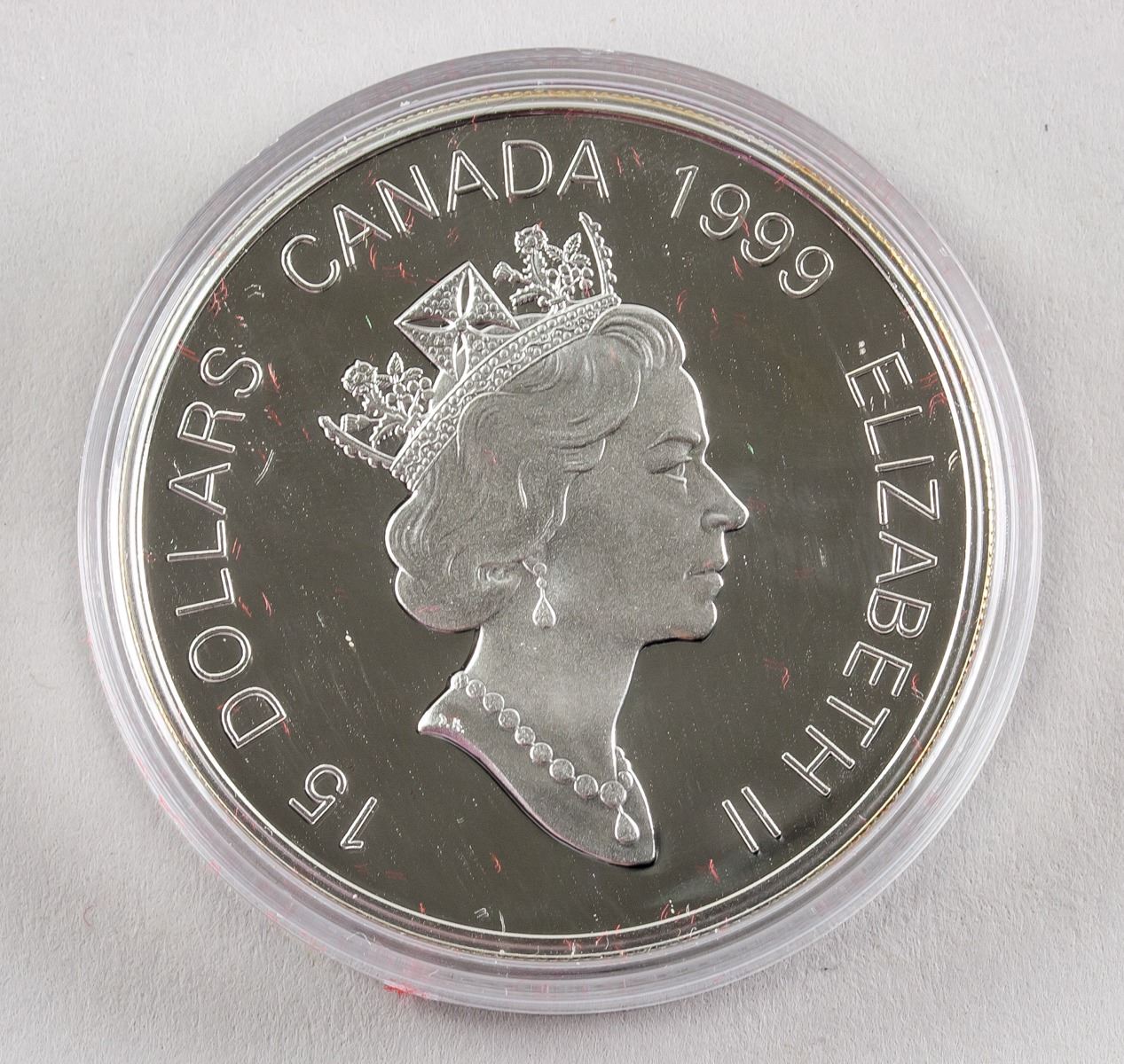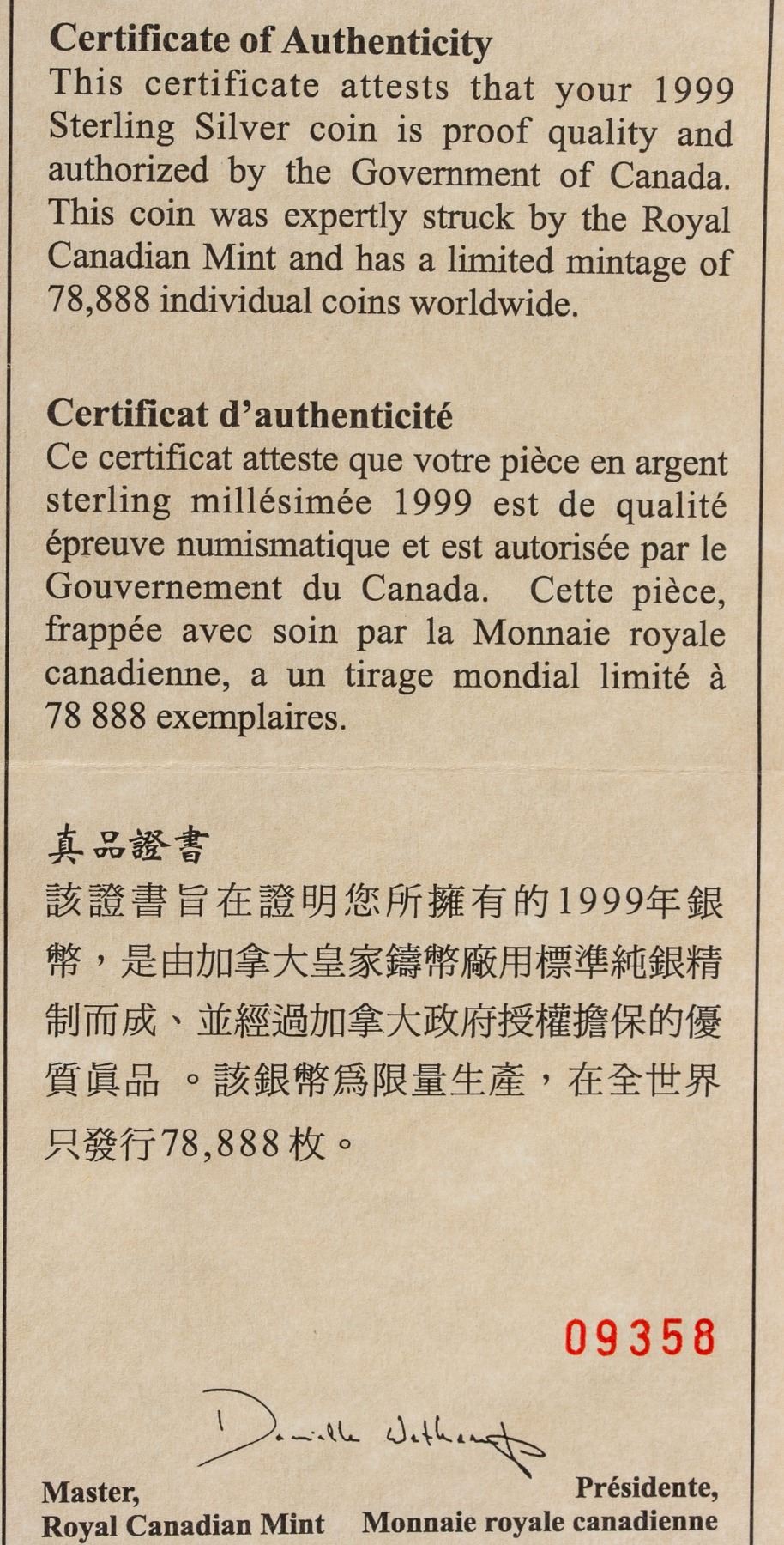 1999 Canadian Chinese Lunar Year 1 Dollar silver (.925) Coin, obverse engraved portrait of Queen Elizabeth II, lettering 15 DOLLARS CANADA 1999 ELIZABETH II, reverse engraved rabbit and 12 zodiac animals, with certificate, serial number 09358, Diameter: 3.9 cm