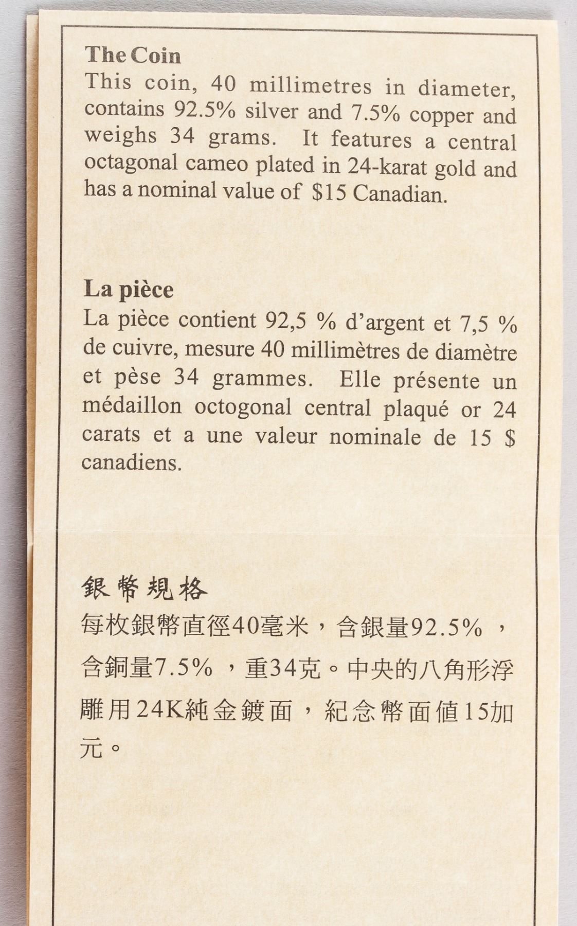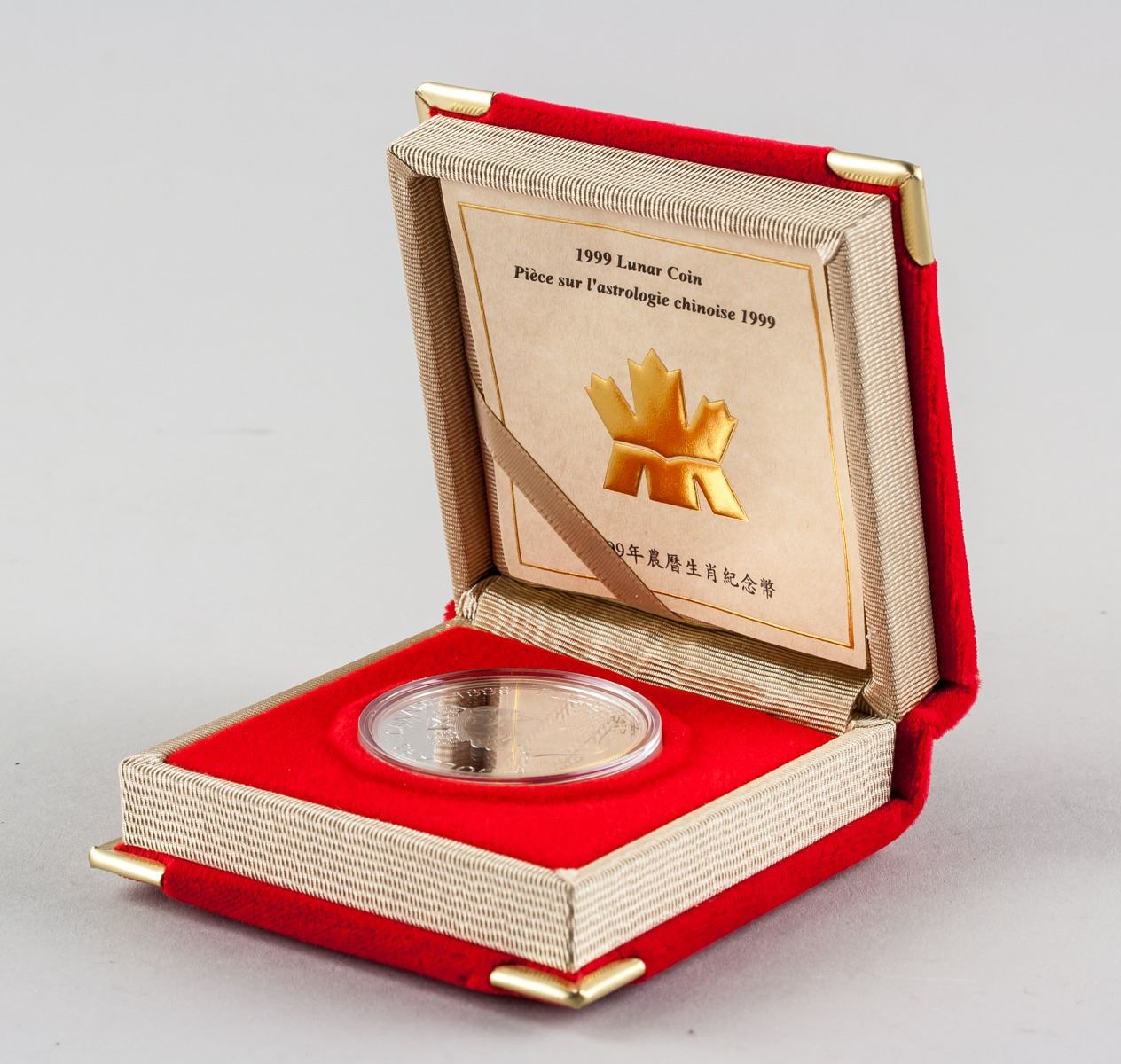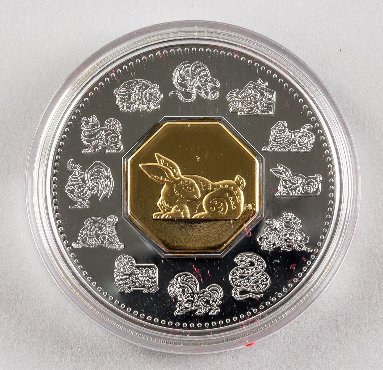 1999 Canadian Chinese Lunar Year 1 Dollar silver (.925) Coin, obverse engraved portrait of Queen Elizabeth II, lettering 15 DOLLARS CANADA 1999 ELIZABETH II, reverse engraved rabbit and 12 zodiac animals, with certificate, serial number 09358, Diameter: 3.9 cm