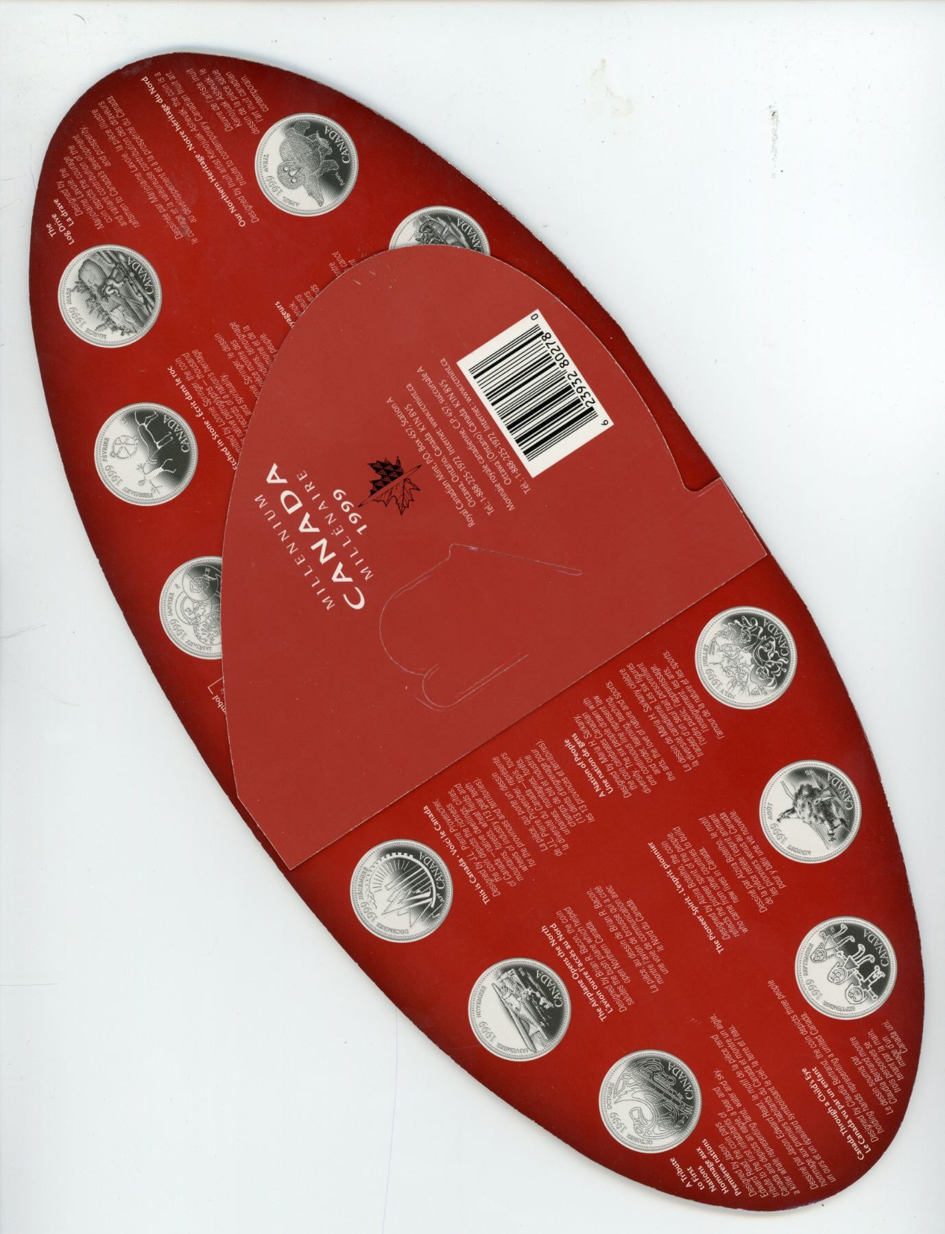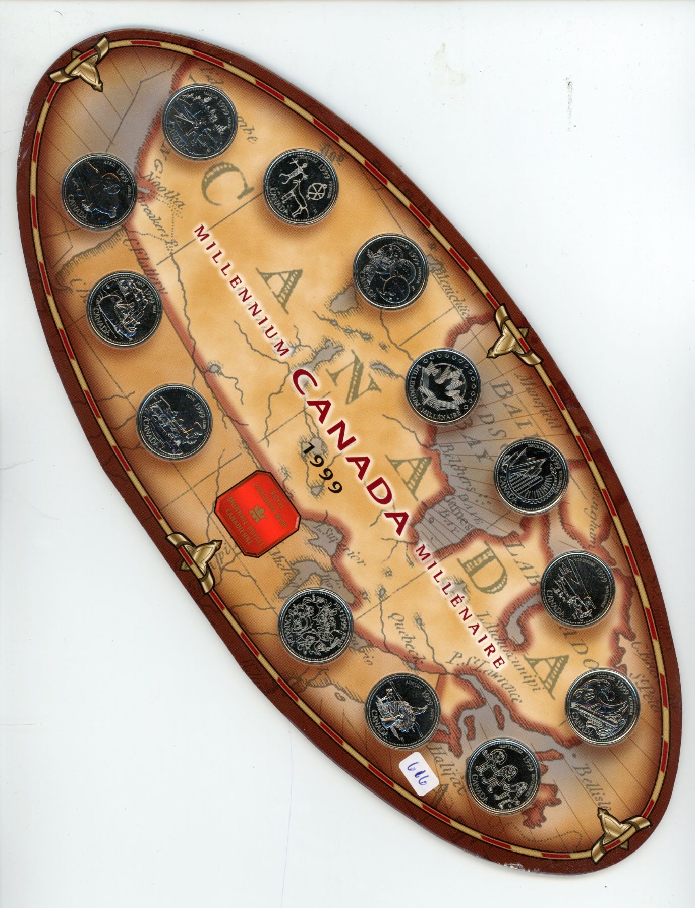 1999 Canadian Millennium 25 Cents. Complete set of 12 Canadian 25 Cents, one for each month, plus a Royal Canadian Mint Millennium medal only available in this set. Housed in its original Royal Canadian Mint packaging.