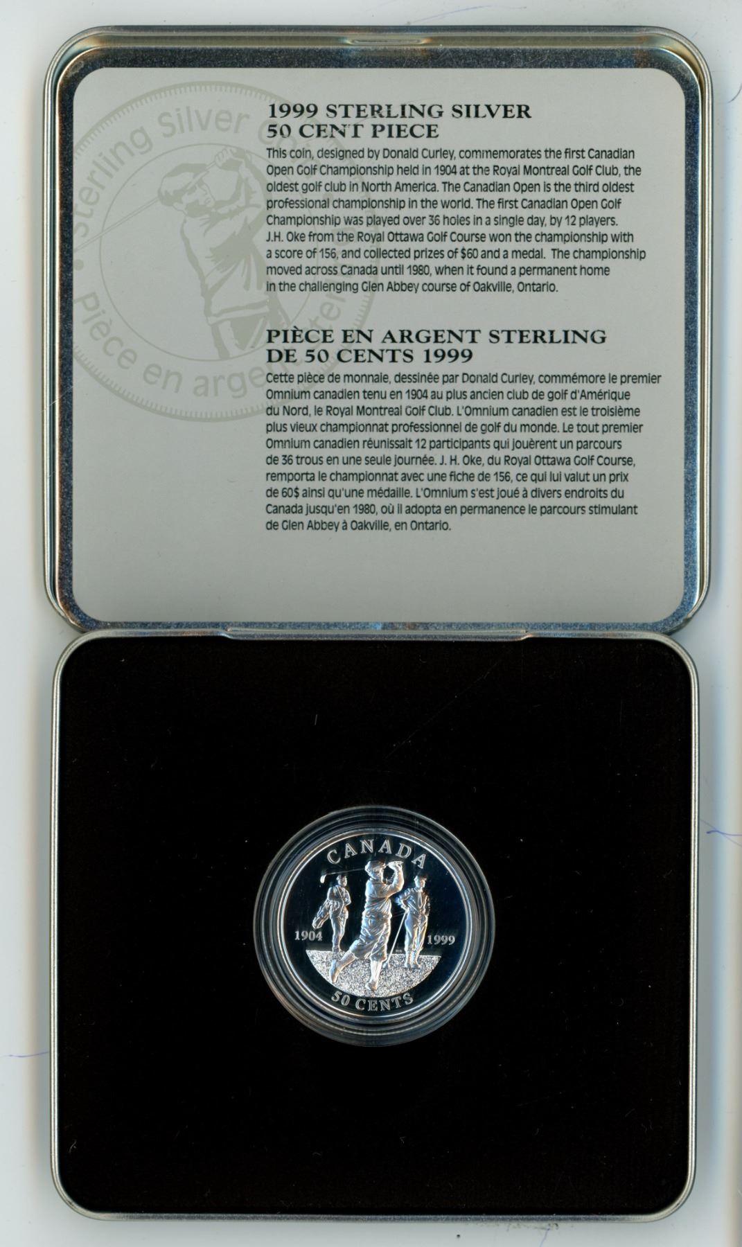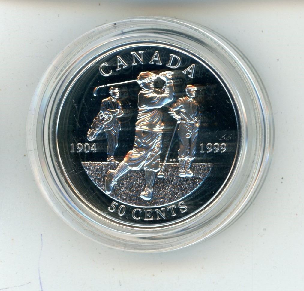 1999 Canadian sterling silver "Golfing" 50 cent coin, in case