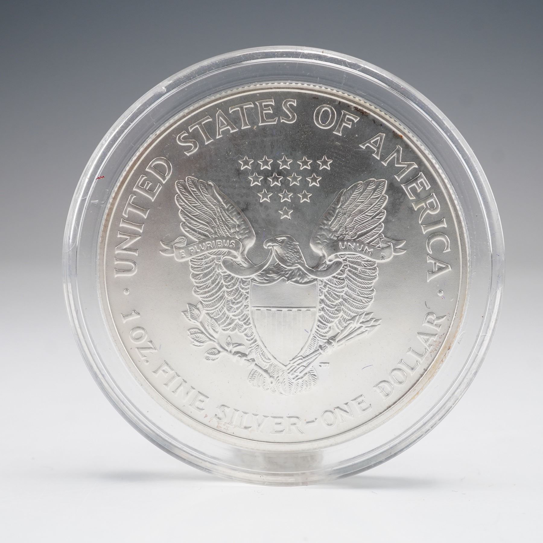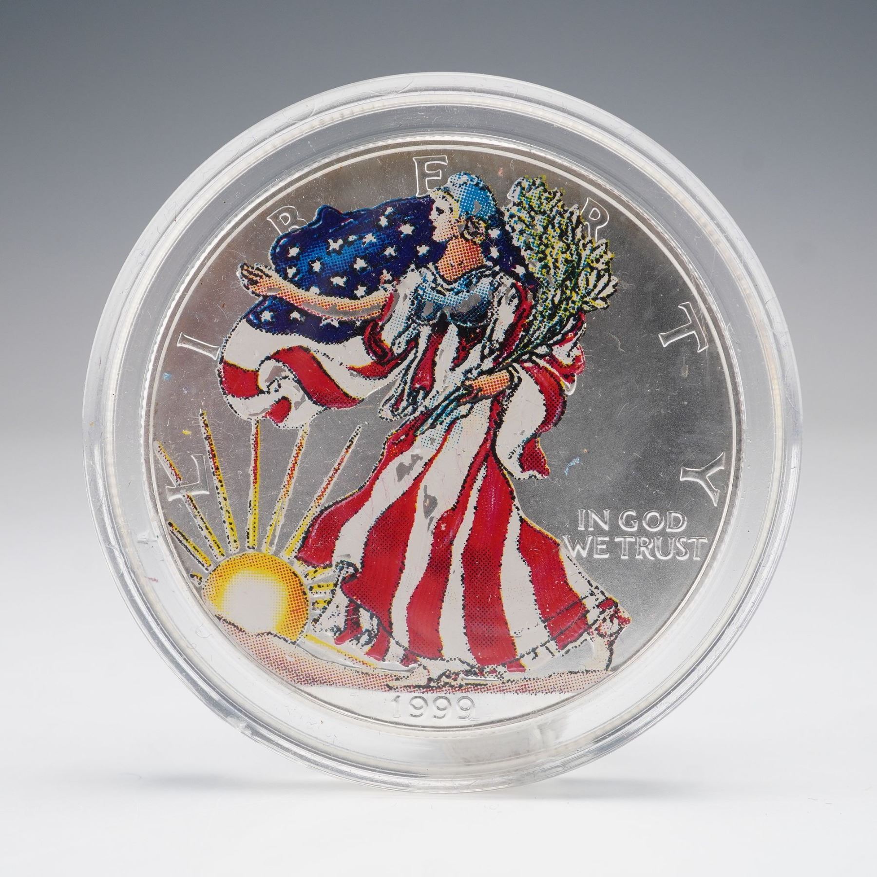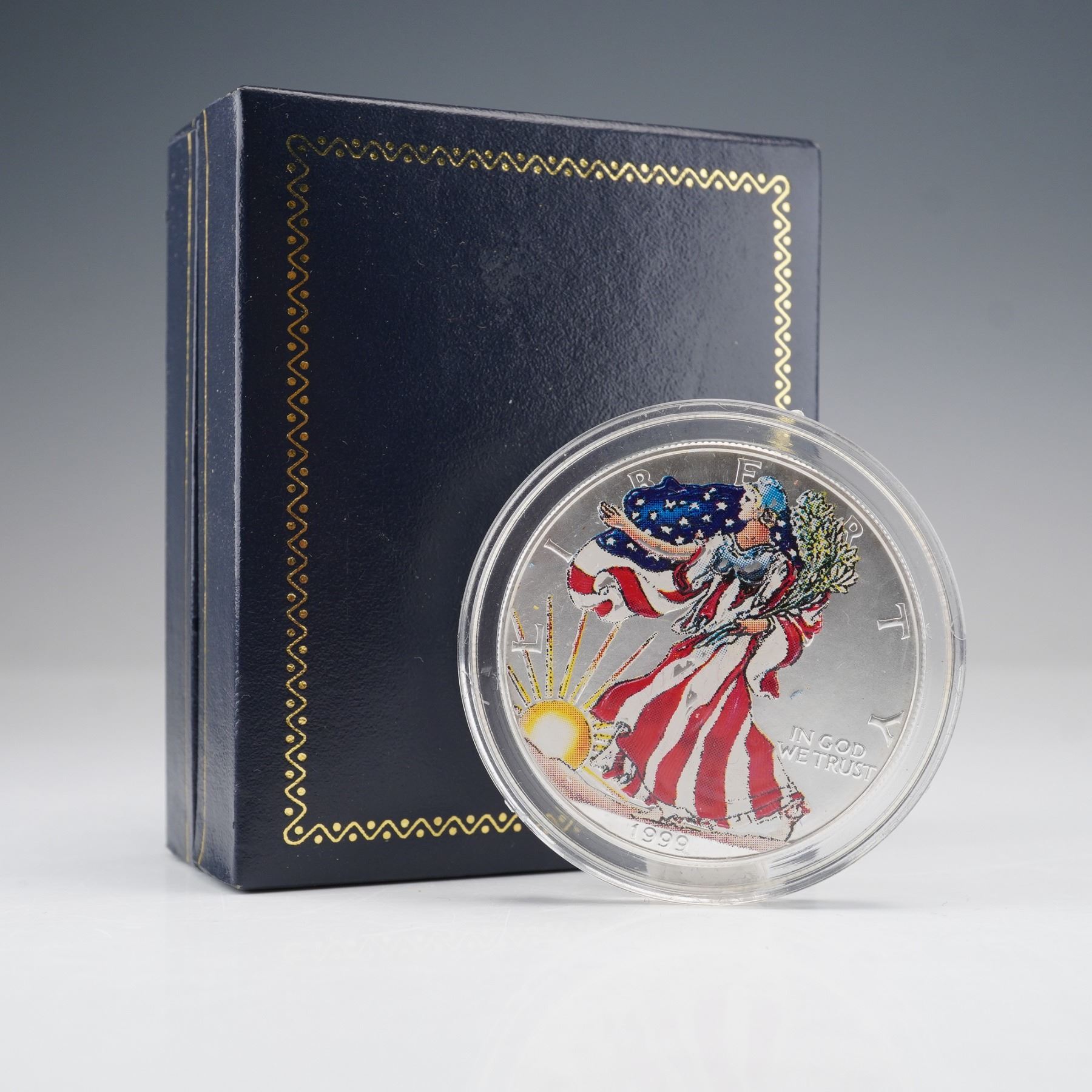 The obverse features the iconic Walking Liberty design, depicting Lady Liberty draped in the American flag with her right hand extended and branches of laurel and oak in her left, with the inscriptions LIBERTY, IN GOD WE TRUST, and the year 1999. The reverse, displays a heraldic eagle with a shield, holding arrows and an olive branch, beneath thirteen stars representing the original colonies, with the inscriptions UNITED STATES OF AMERICA, 1 OZ. FINE SILVER, and ONE DOLLAR. Metal Content: One troy ounce of .999 fine silver.