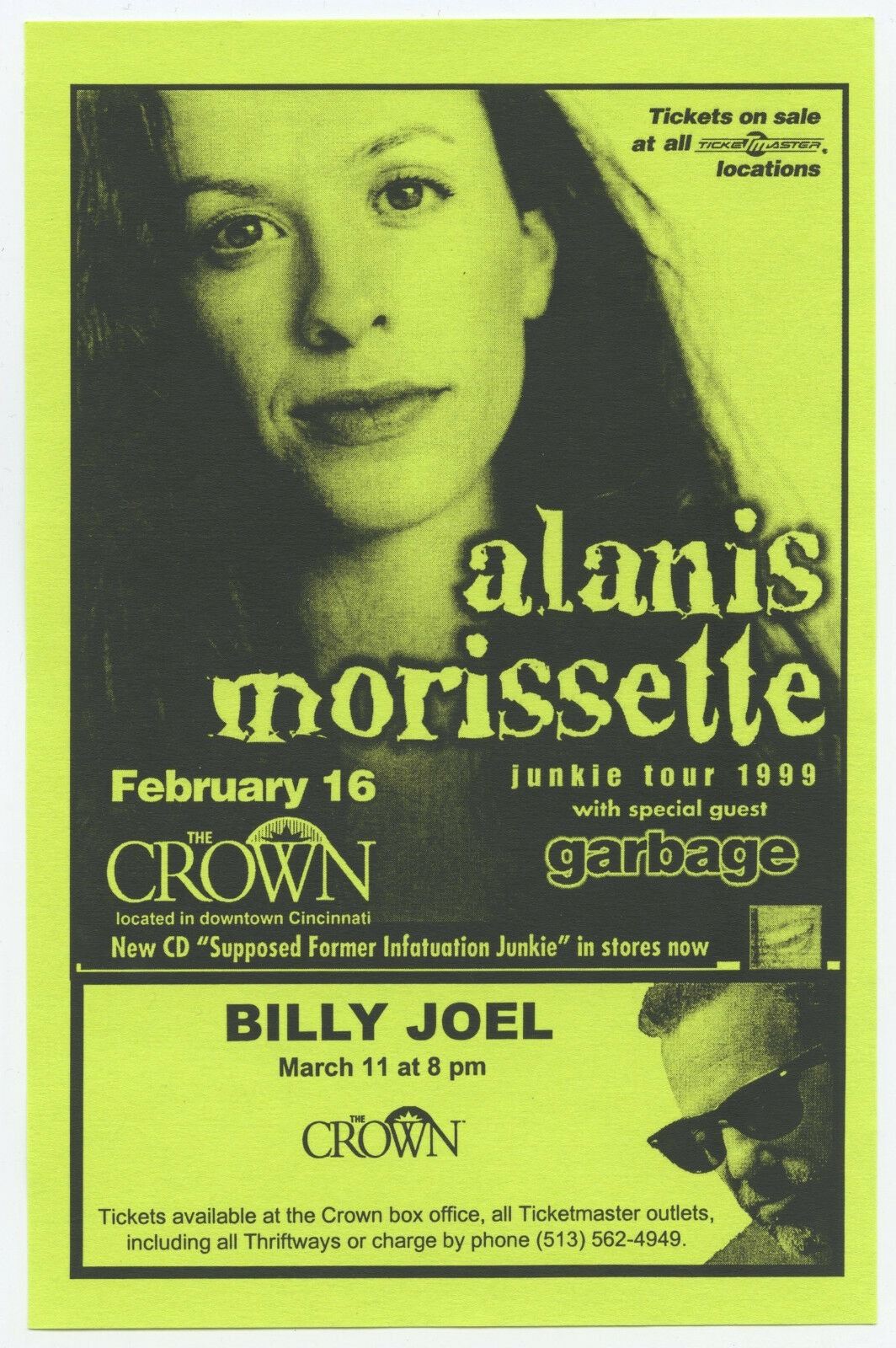 1999 Concert Handbill / Flyer Alanis Morissette / Garbage / Billy Joel at THe Crown, Cincinnati, OH.