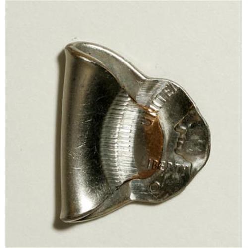 <B>1999-? 25C Connecticut Statehood Quarter--Foldover Strike--MS65 Uncertified.</B></I> This Connecticut quarter was incorrectly fed between the dies, with a nearly vertical placement. The force of the strike bent the piece near its center. It folded over with an unstruck seam and a struck flat border. The edges of the piece show traces of the copper core. The left central third of the designs are present, with the mintmark off the flan.<BR><BR><b>Shipping:</b> Coins & Currency (<a target="_blank" href="http://www.heritageauctions.com/common/shipping.php">view shipping information</a>)