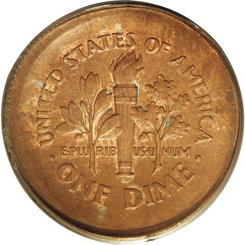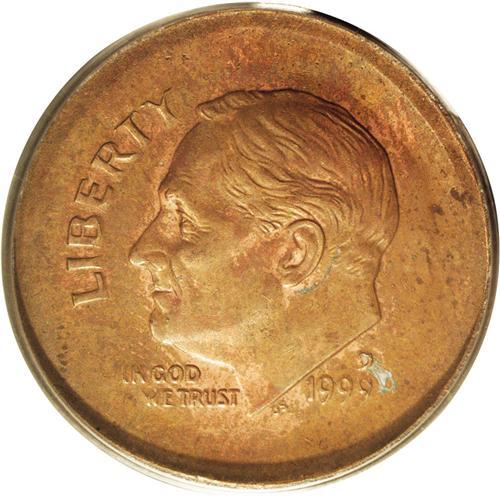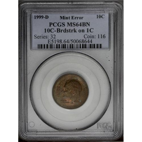<B>1999-D<10C> Roosevelt Dime--Broadstruck on a Cent Planchet--MS64 Brown PCGS.</B></I> A dramatic error that accentuates the fact that the planchet was incorrect by the broadstruck features. The devices are generally sharp although some of the peripheral lettering displays the distortions caused by the expansion of the planchet during the strike. Traces of zinc alloy are seen in a few places on the obverse and reverse.<BR><I>From The Bellaire Collection, Part Two.</B></I> <BR><BR><B>Important notice:</B> Heritage usually auctions material at the rate of 200-250 lots per hour. On some occasions eBay Live bid software or the Internet may not be able to keep up with the pace of the auction. We recommend placing a realistic absentee bid now as insurance to avoid disappointment. Occasionally the auctioneer may eliminate or reject an eBay Live bid, and the auctioneer may also reopen a lot after the close of the eBay live bidding (usually because we missed an audience bid), and may reject your bid even if it shows you as the winning bidder. By bidding via eBay Live, you agree that Heritage may award the lot to another bidder at its sole discretion under the circumstances described above or any other reasonable circumstances. Since eBay bids are not shown to us until we open the lot on the floor, we treat those bids just like floor bids. In most cases the floor responds before the eBay bid is presented to us, due to Internet lag time, so for consistency we have made it a policy that floor bids are always considered first over tie eBay live bids. Also please note that all Heritage lots purchased through eBay Live carry a 20% Buyer's Premium. Please make sure you read the Terms and Conditions before you bid. This lot is being auctioned in conjunction with a live floor auction by Heritage Galleries & Auctioneers. All final auction and invoice information will be supplied by Heritage Galleries & Auctioneers, and all other information should be considered preliminary. Lot:5328 <BR><BR><B>Winning Notification and Billing:</B> After the FINAL session in this auction is complete, Heritage will send e-mail and snail mail invoices. This process normally takes several days. All final auction and invoice information will be supplied by Heritage Galleries & Auctioneers, and all other information should be considered preliminary. <BR><BR>This auction will be conducted on a live auction floor and over the Internet through eBay Live. If you choose to place an absentee bid, please take a moment to <font color='#0000ff'><u><a href='http://pages.ebay.com/liveauctions/help/before/laabsentee.html'>learn how eBay Live absentee bidding works</a></u></font><font color='#000000'>