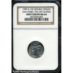 <B>1999-D 10C Roosevelt Dime--Double Strike, Second Strike 75% Off Center--MS64 NGC.</B></I> The second strike is off-center at 12 o'clock with the obverse details mostly obliterated and the reverse normal. Lustrous light gray with good eye appeal. Lot:10992