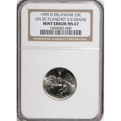 <B>1999-D 25C Delaware Statehood Quarter--on a 5C Planchet, 5.0 Grams--MS67 NGC.</B></I><BR><BR><b>Shipping:</b> Coins & Currency (<a target="_blank" href="http://www.heritageauctions.com/common/shipping.php">view shipping information</a>)