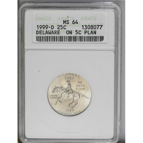 <B>1999-D<25C> Delaware Statehood Quarter--Struck on Five Cent Planchet--MS64 ANACS.</B></I> All legends and devices are intact, although peripheral elements show metal flow toward the rim. The major devices are well struck for a wrong planchet error.