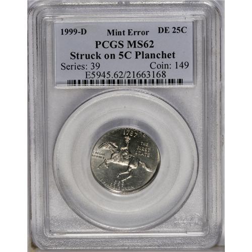 <B>1999-D<25C> Delaware Statehood Quarter--Struck on a Five Cents Planchet--MS62 PCGS.</B></I> Uncentered toward 10 o'clock, although portions of the edge are reeded. This lustrous and lightly abraded wrong planchet error has light chestnut toning.