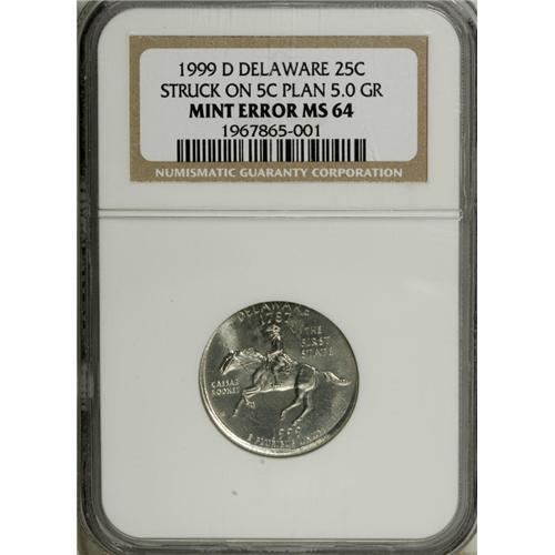 <B>1999-D 25C Delaware Statehood Quarter--Struck on a Nickel Planchet--MS64 NGC.</B></I> A suitably impressed and lustrous off-metal error. The state's name is partially off the flan, due to its atypically small size.<BR><BR><b>Shipping:</b> Coins & Currency (<a target="_blank" href="http://www.heritageauctions.com/common/shipping.php">view shipping information</a>)