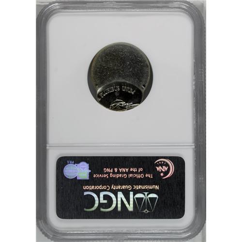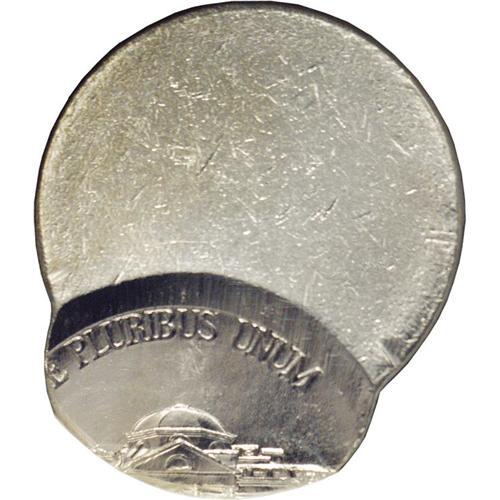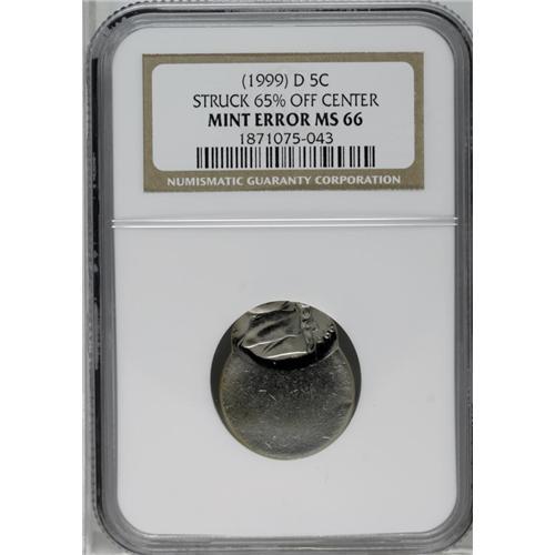 <B>1999-D<5C> Jefferson Nickel--Struck 65% Off-Center--MS66 NGC.</B></I> Struck off-center at 12 o'clock with a partial date visible, including both 9's and the mintmark. Fully lustrous light gray surfaces with reflective fields on the struck portion of this piece. The blank, unstruck portion clearly shows all of the tiny nicks that are always found on the blanks prior to striking.