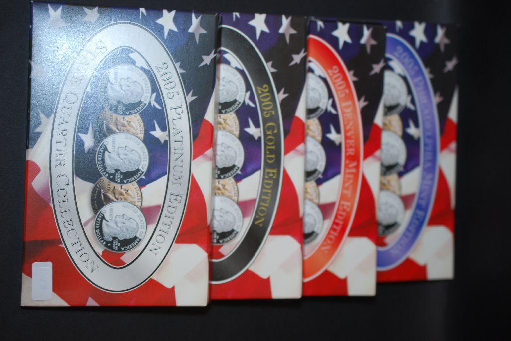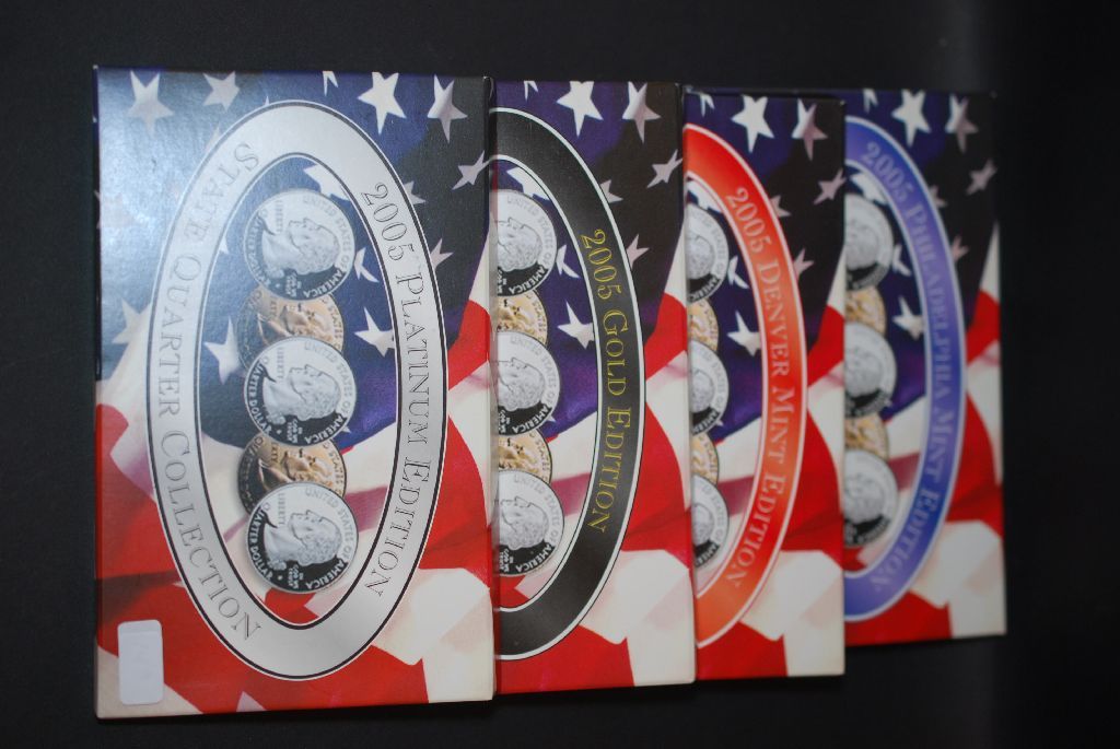 1999-D US Mint State Quarter Coin Set With COA Included; BU; 1999-P US Mint State Quarter Coin Set With COA Included; BU; 1999-P US Mint State Quarter Coin Set With COA Included; Platinum Layered; BU & 1999-D US Mint State Quarter Coin Set With COA Included; Gold Layered; BU; Lot of 4 Sets; EST. $15-25