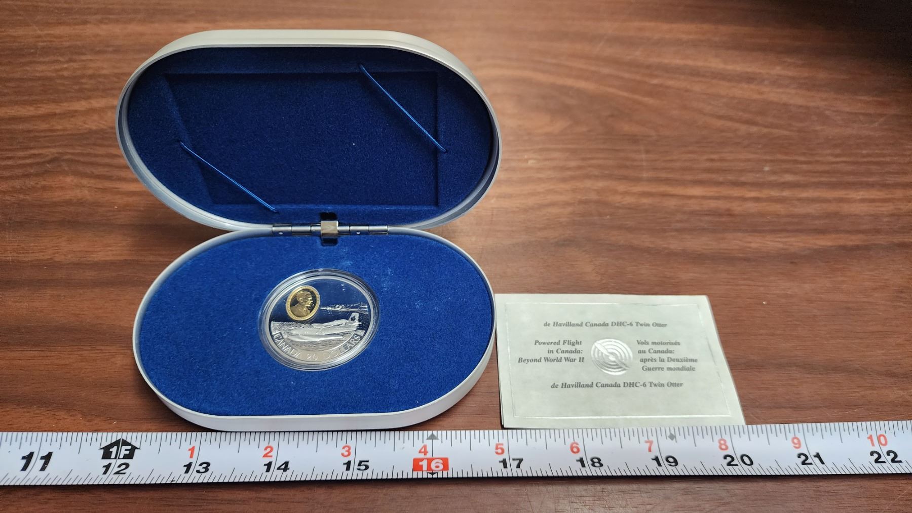 1999 DHC-6 Twin Otter $20. The famous Canadian bush plane is reproduced in Sterling Silver with 24-karat Gold Plating on the Cameo. Proof with Ultra Heavy Cameo. Housed in its original RCM case of issue.