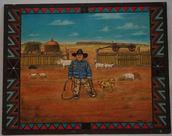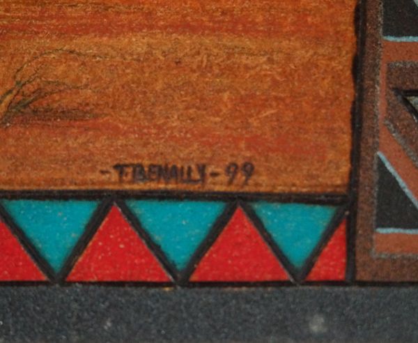 1999 Fabulous Woodburned Picture by Thomas Benally, measures 13''H x 15.75''W, this piece is mixed media using woodburning, sandpaint, colored pencils, pastels, and turquoise stones, #126,663, ''This is my land, This is my life, Depicting a scene from reservation'', signed on lower left corner and also signed and dated on back along with other information, very unique and beautiful piece