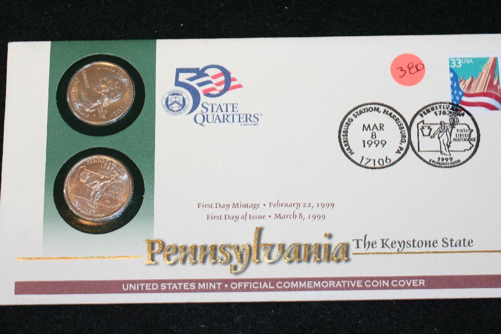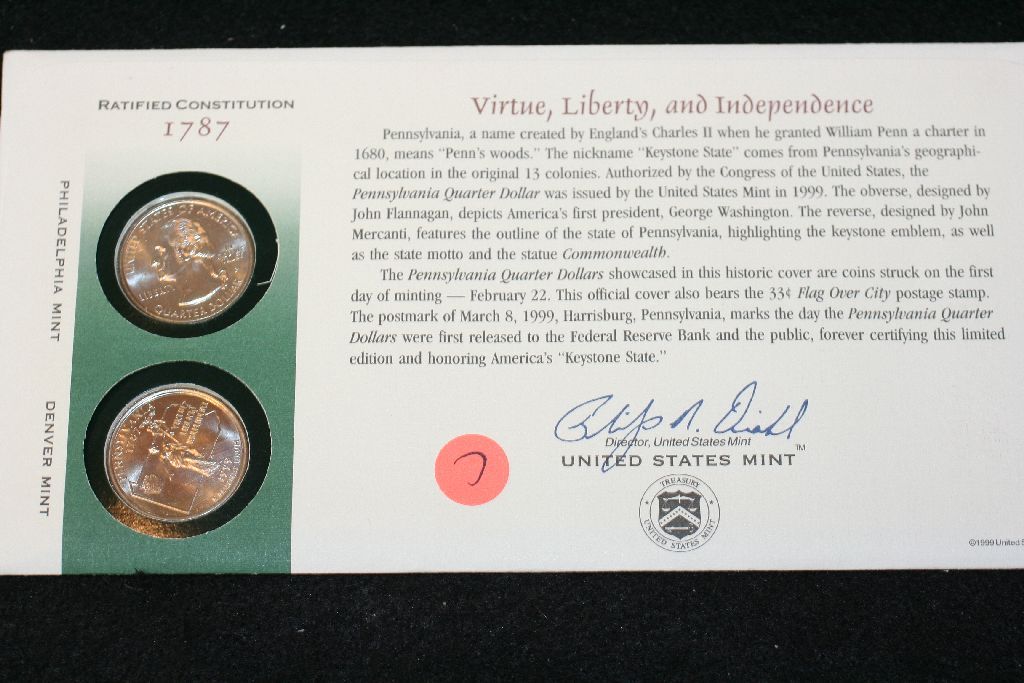 1999 First Day Issue Pennsylvania State Quarter Set W/Postal Stamp; P&D Mints
