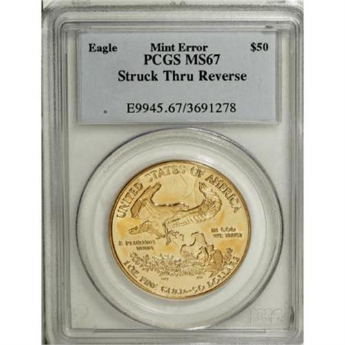 <B>1999 G$50 One-Ounce Gold Eagle--Struck Thru Reverse--MS67 PCGS.</B></I> <BR><BR><b>Shipping:</b> Coins & Currency (<a target="_blank" href="http://www.heritageauctions.com/common/shipping.php">view shipping information</a>)