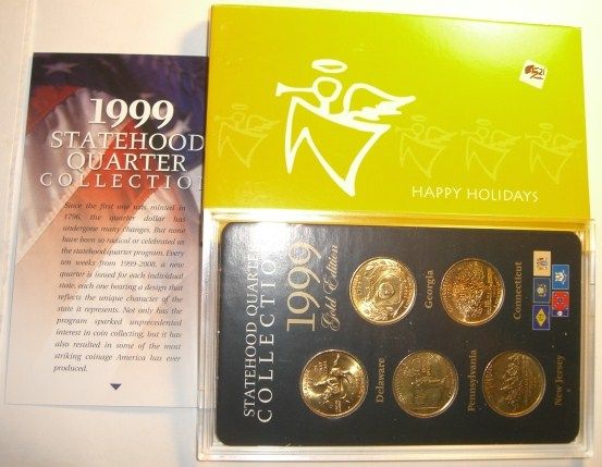 1999 GOLD EDITION STATEHOOD QUARTER COLLECTION *INCLUDES DE/PA/NJ/GA/CT*!! COMES IN HOLIDAY PACKAGE!! SET CAME OUT OF SAFE DEPOSIT BOX!! ***Coin, Currency & All Items Listed in this auction - Grades, Conditions and Values are not Safe Deposit Coins LLC Responsibilty. Grades, Condition and Values are determined by Consigner(s) & Buyers ONLY