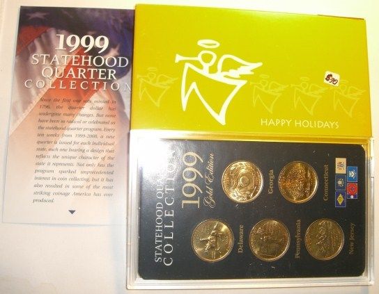 1999 GOLD EDITION STATEHOOD QUARTER COLLECTION *INCLUDES DE/PA/NJ/GA/CT*!! COMES IN HOLIDAY PACKAGE!! SET CAME OUT OF SAFE DEPOSIT BOX!! ***Coin, Currency & All Items Listed in this auction - Grades, Conditions and Values are not Safe Deposit Coins LLC Responsibilty. Grades, Condition and Values are determined by Consigner(s) & Buyers ONLY