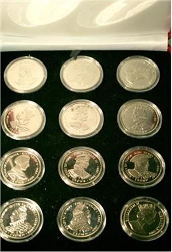 Original 12 piece One Crown Coin set, BU with cameos. Features the most famous Kings & Queens of England including Alfred the Great , Canute, Edward the Confessor, William the Conqueror, Henry, John, Richard, Elizabeth & Charles. Beautifully designed, encapsulated and displayed in red leather case of issue. No return.