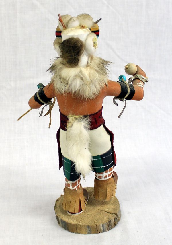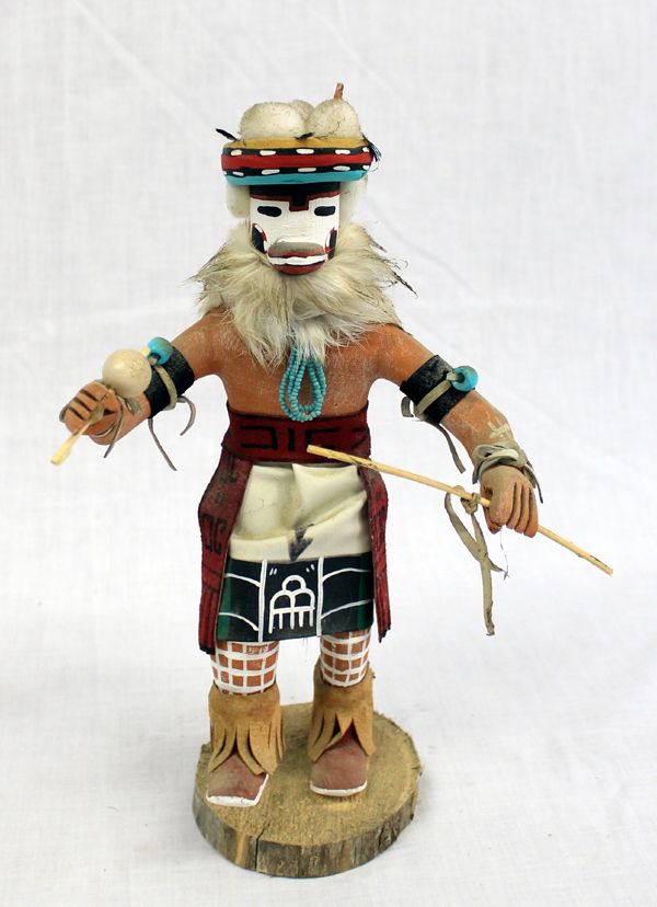 1999 Hopi Deer Kachina by R. Lee, measures 10''H, features leather dance kilt and sash, fringed leather wrist and leg cuffs, bead and leather arm cuffs, gourd rattle and turquoise seed bead necklace, mounted on wooden stand, signed by artist on bottom along with name of kachina and date, ''R Lee Deer Kachina 12/99''