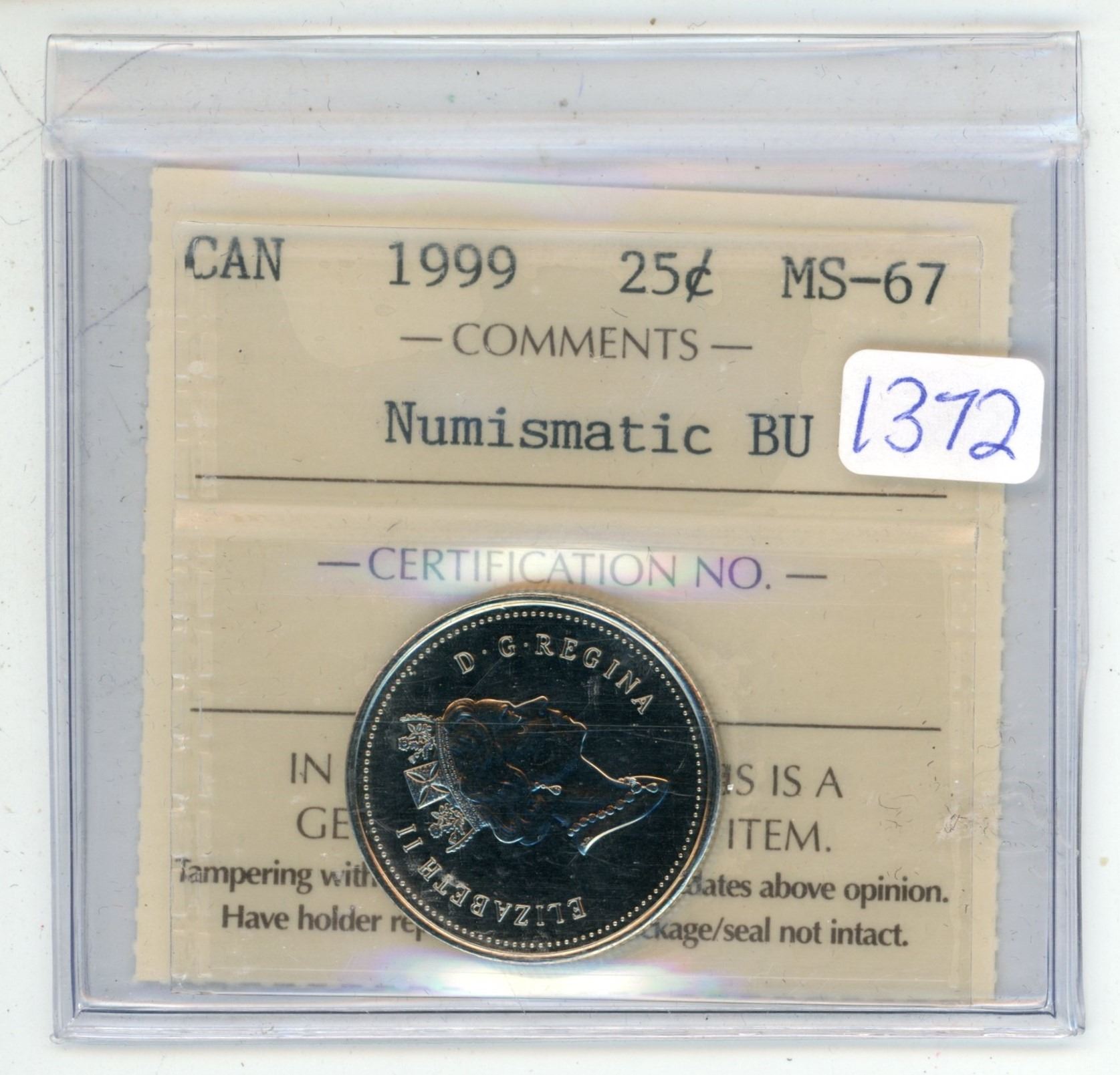 1999 ICCS graded, Canadian 25 cent coin - MS67