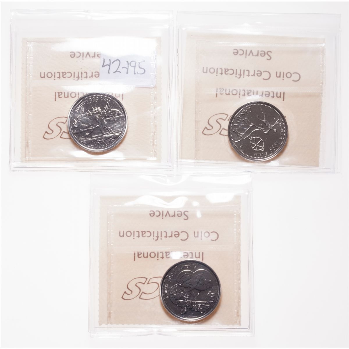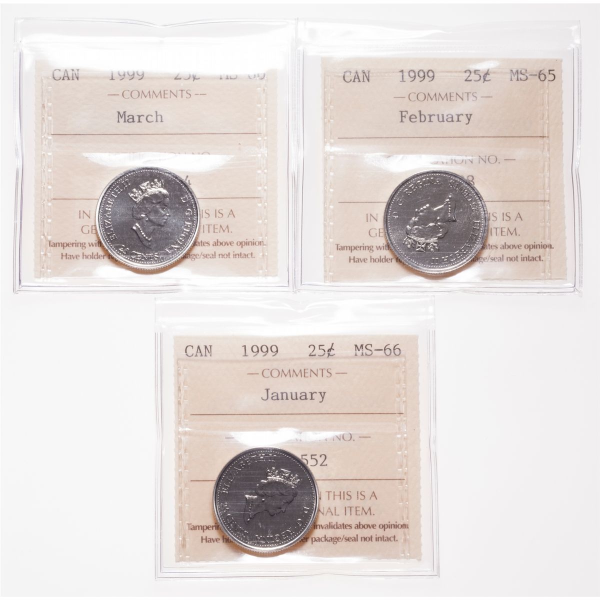 1999. January. Normal Letters; 1999. March. Both ICCS Mint State-66; 1999. February. ICCS Mint State-65. All three (3) Gems are tied 'Finest' certified by ICCS.