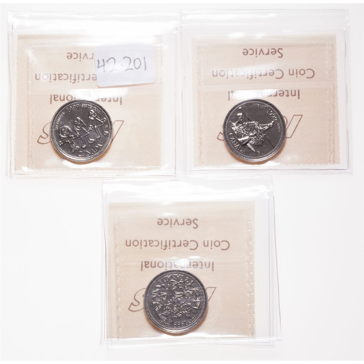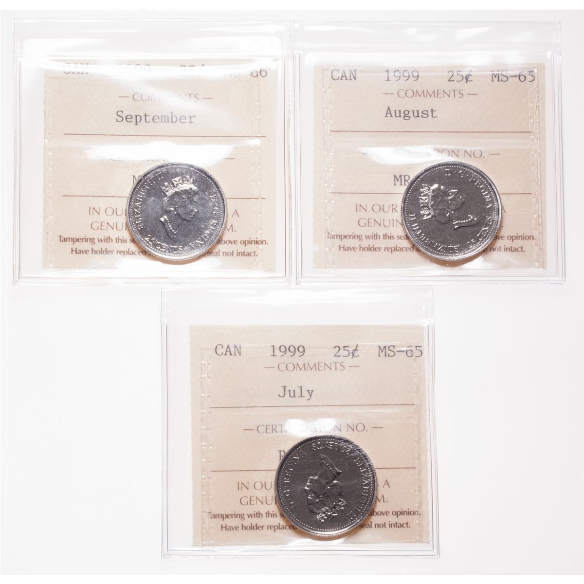 1999, July; 1999, August. Both ICCS Mint State-65 and both tied for the second 'Finest' certified by ICCS; 1999, September. ICCS Mint State-66. Tied for the 'Finest' certified by ICCS. Lot of three (3) Gems.