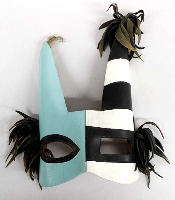 Massey Estate: 1999 Leather Koshare Clown Mask, initialed by the artist D.A.K., Cottonwood, Arizona artist, embellished with feathers, measures 11'' x 9'' x 3.5'', well executed and hand painted