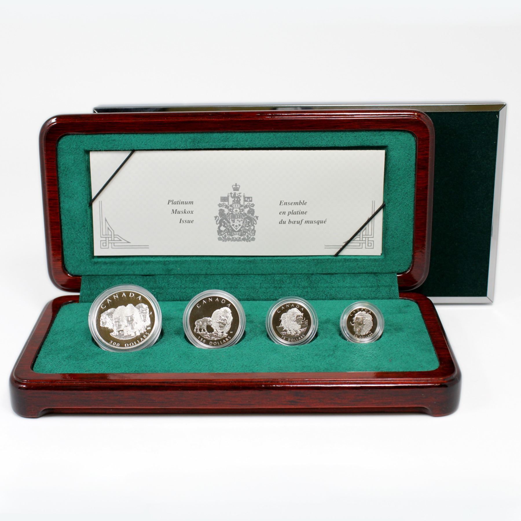 1999 Muskox 4-coin Fractional Fine Platinum Set in Deluxe Wooden Display Case. You will receive 1oz, 1/2oz, 1/4oz & 1/10oz platinum coins. Low mintage of only 500 sets!!! (TAX Exempt)