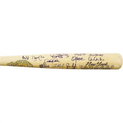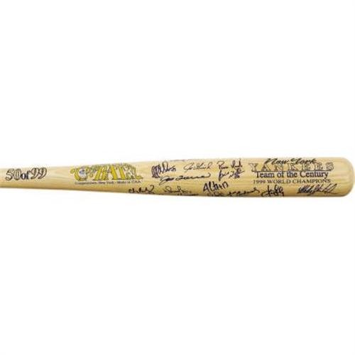 <B>1999 New York Yankees Team Signed Bat.</B></I> The most dominant playoff edition of all from the modern Bronx dynasty, the 1999 Yanks played just a single game beyond the minimum in October in their unstoppable march to the World Championship. Twenty-four members of this pinstriped juggernaut appear in 10/10 blue sharpie upon the offered Cooperstown Bat Co. lumber, numbered "50" of a limited run of ninety-nine. Highlights include Jeter, Torre, Williams, Cone, El Duke, Knoblauch, Rivera, Strawberry, Mendoza, Leyritz and more. There's still room to chase down a few stragglers, and any of them would be thrilled to be reminded of these glory days. <I>LOA from PSA/DNA. LOA from James Spence Authentication.</B></I><BR><BR><b>Shipping:</b> Bats, Clubs, Sticks, Swords, Rif (<a target="_blank" href="http://www.heritageauctions.com/common/shipping.php">view shipping information</a>)