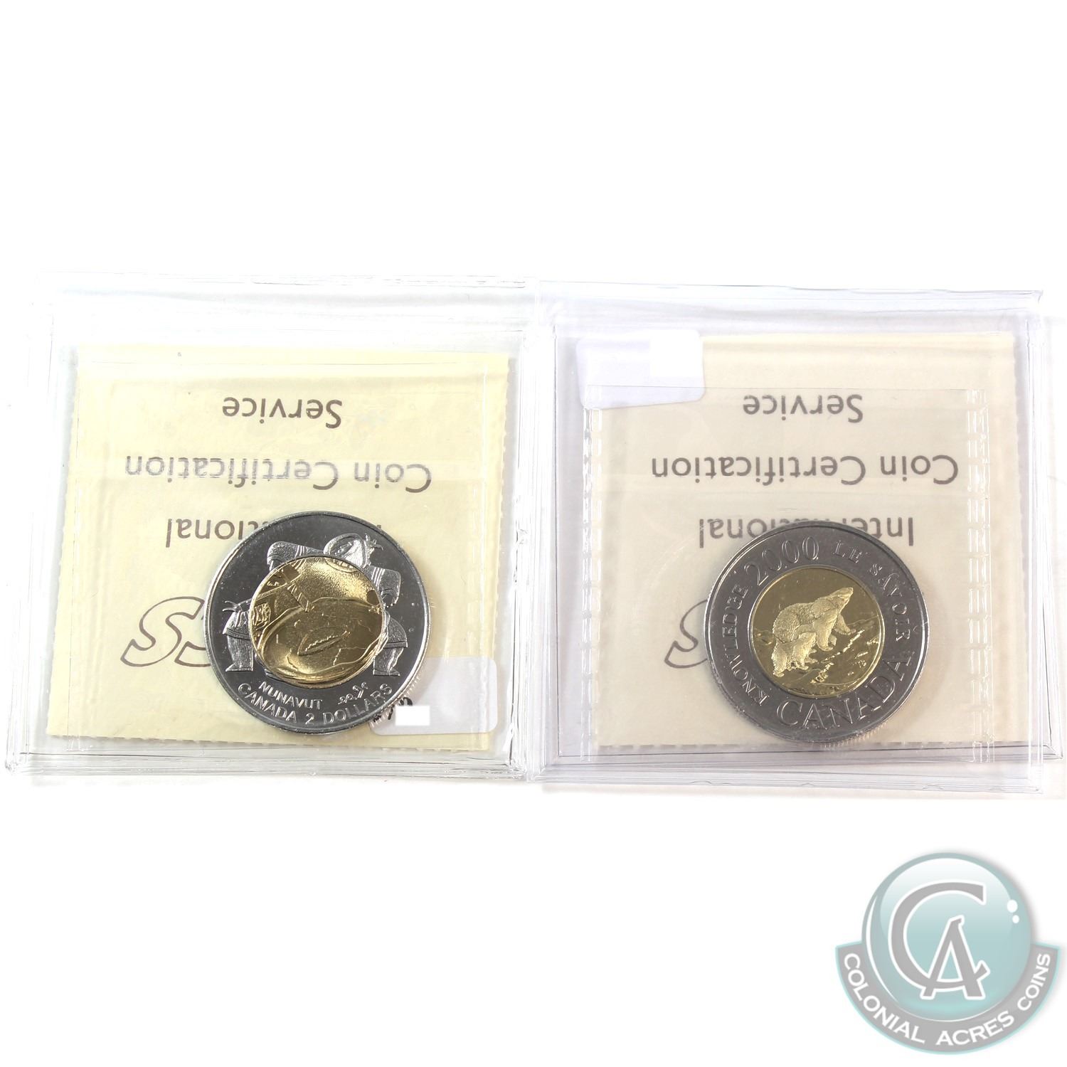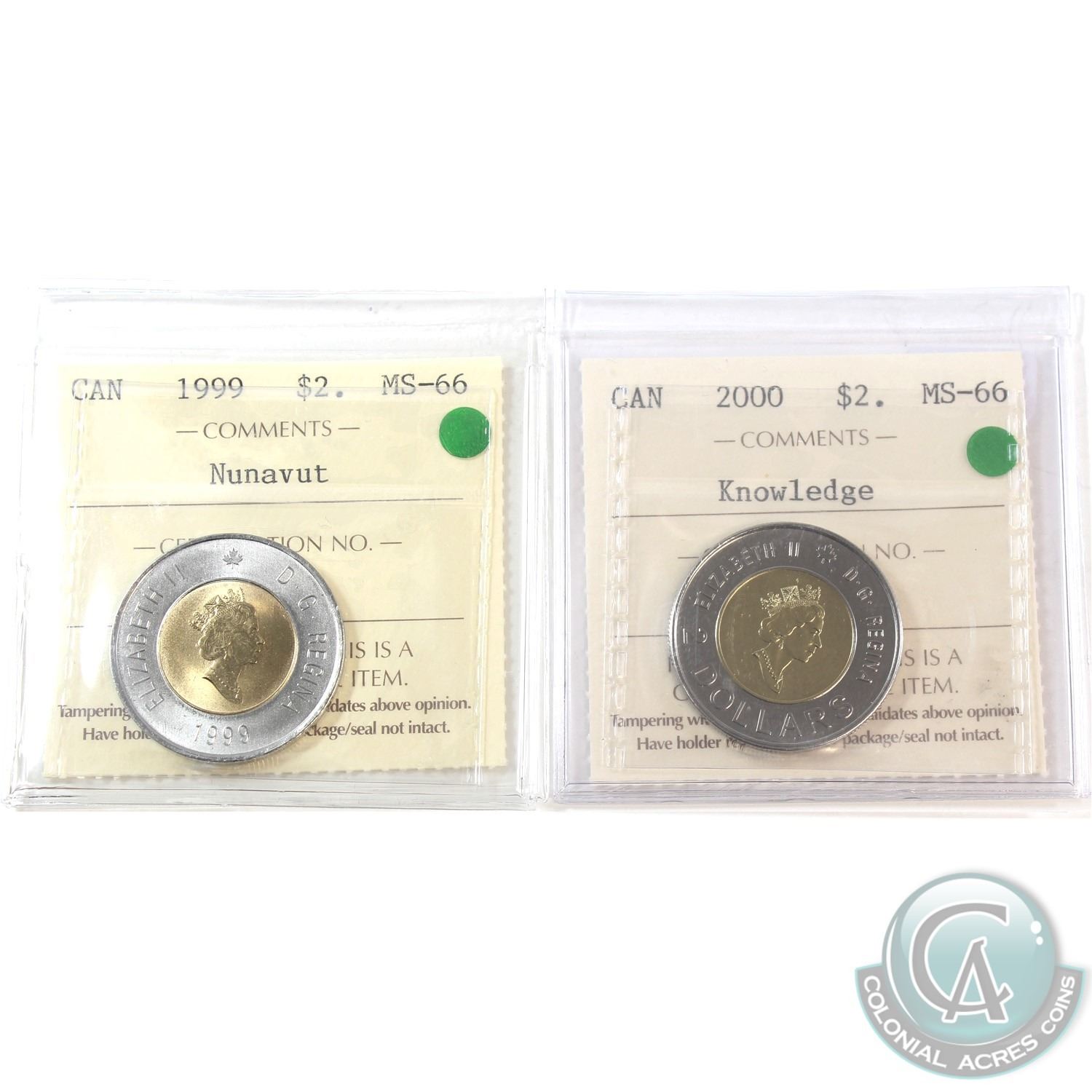 1999 Nunavut & 2000 Knowledge Two Dollar ICCS Certified MS-66. 2pcs