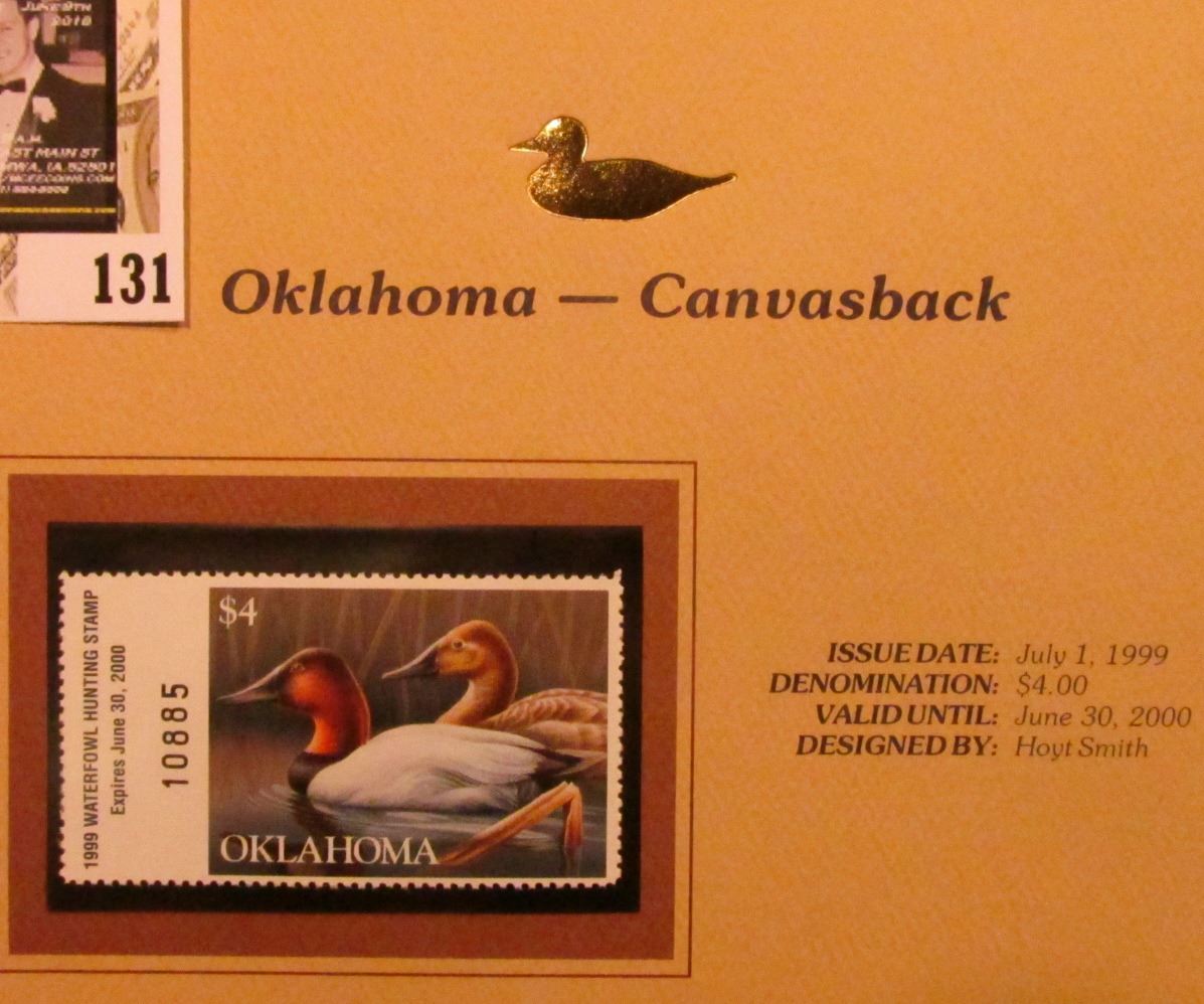1999 Oklahoma-Canvasback Waterfowl $4.00 Stamp. Mint Condition with literature, unsigned.
