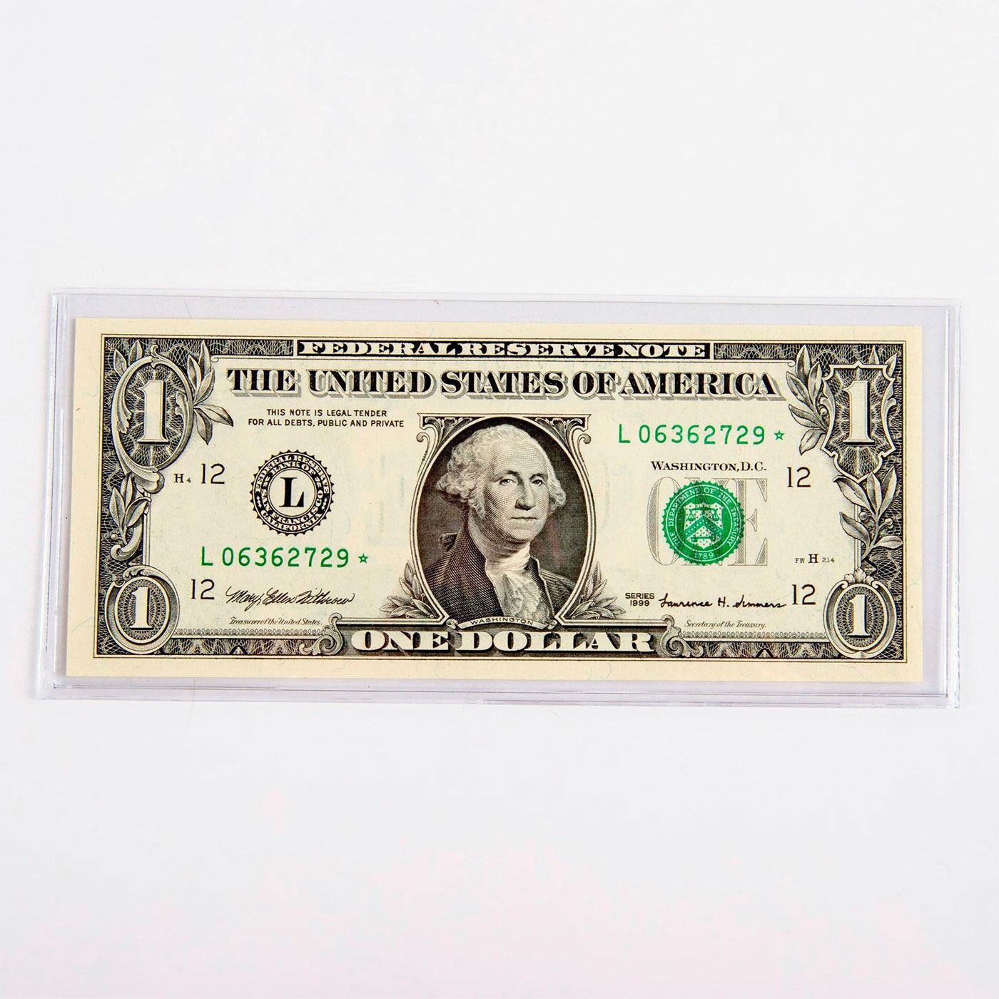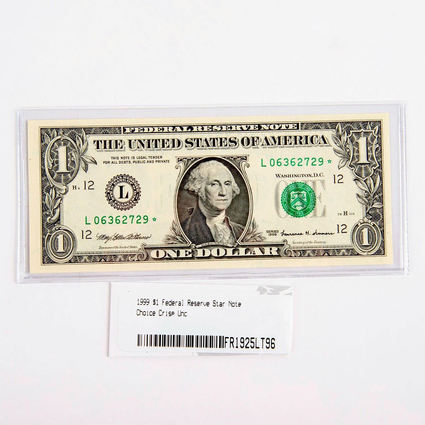 Choice Crisp Uncirculated. Serial Number L06362729*. When a flawed or damaged note is discovered, it is replaced with one bearing a star at one end of the serial number. This note features the San Francisco Federal Reserve District seal. With green seal and serial numbers. Withrow-Summers signatures. #Numismatists #coin #currency #UScurrencynote #StarNote